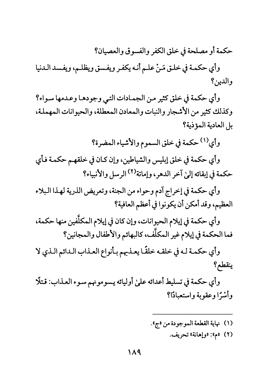 وأي حكمة في خلق إبليس والشياطين، وإن كان في خلقهم حكمة فأي حكمة في إبقائه إلى آخر الدهر، وإماتة (¬٢) الرسل والأنبياء؟