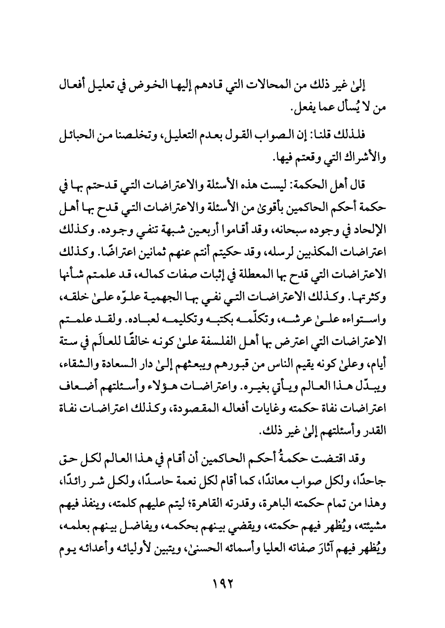 قال أهل الحكمة: ليست هذه الأسئلة والاعتراضات التي قدحتم بها في حكمة أحكم الحاكمين بأقوى من الأسئلة والاعتراضات التي قدح بها أهل الإلحاد في وجوده سبحانه، وقد أقاموا أربعين شبهة تنفي وجوده. وكذلك اعتراضات المكذبين لرسله، وقد حكيتم أنتم عنهم ثمانين اعتراضًا. وكذلك الاعتراضات التي قدح بها المعطلة في إثبات صفات كماله، قد علمتم شأنها وكثرتها. وكذلك الاعتراضات التي نفي بها الجهمية علوّه على خلقه، واستواءه على عرشه، وتكلّمه بكتبه وتكليمه لعباده. ولقد علمتم الاعتراضات التي اعترض بها أهل الفلسفة على كونه خالقًا للعالَم في ستة أيام، وعلى كونه يقيم الناس من قبورهم ويبعثهم إلى دار السعادة والشقاء، ويبدّل هذا العالم ويأتي بغيره. واعتراضات هؤلاء وأسئلتهم أضعاف اعتراضات نفاة حكمته وغايات أفعاله المقصودة، وكذلك اعتراضات نفاة القدر وأسئلتهم إلى غير ذلك.