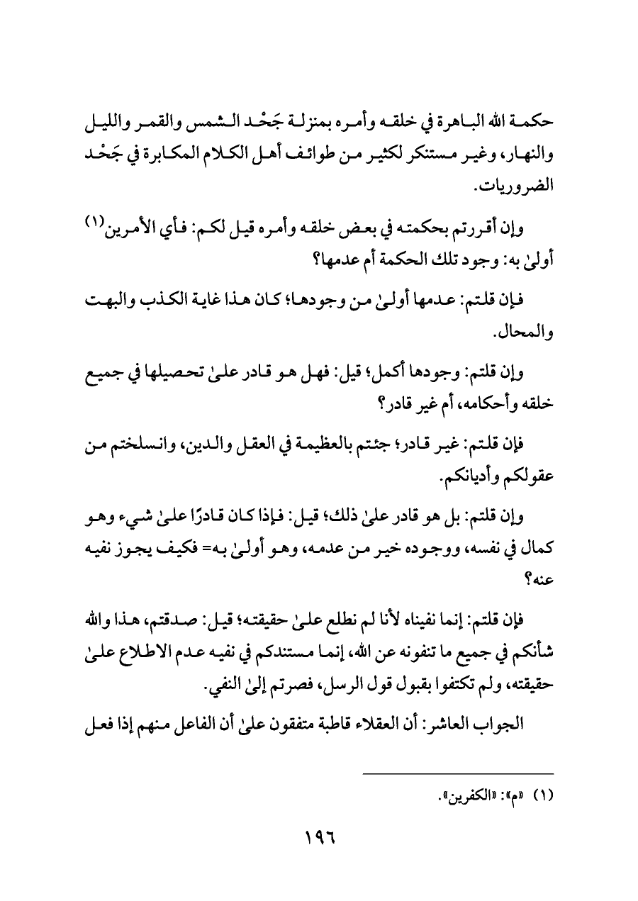 حكمة الله الباهرة في خلقه وأمره بمنزلة جَحْد الشمس والقمر والليل والنهار، وغير مستنكر لكثير من طوائف أهل الكلام المكابرة في جَحْد الضروريات.