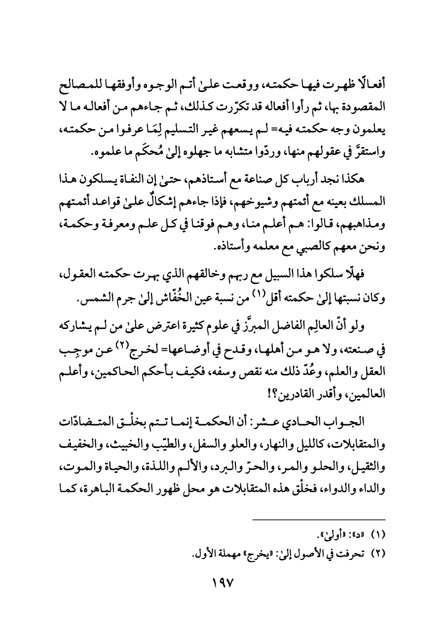 ولو أنّ العالِم الفاضل المبرَّز في علوم كثيرة اعترض على من لم يشاركه في صنعته، ولا هو من أهلها، وقدح في أوضاعها= لخرج (¬٢) عن موجِب العقل والعلم، وعُدّ ذلك منه نقص وسفه، فكيف بأحكم الحاكمين، وأعلم العالمين، وأقدر القادرين؟!