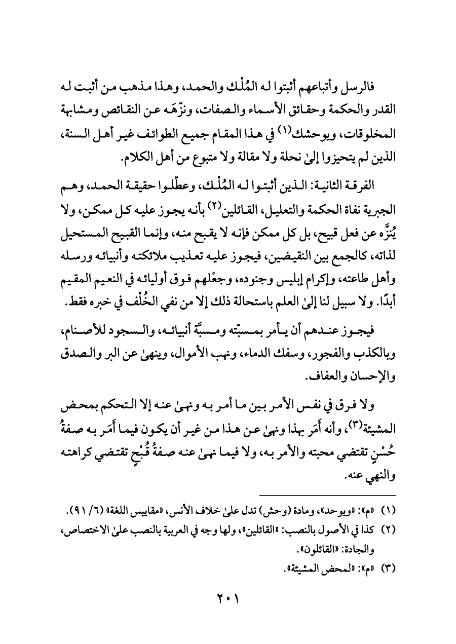 فالرسل وأتباعهم أثبتوا له المُلْك والحمد، وهذا مذهب من أثبت له القدر والحكمة وحقائق الأسماء والصفات، ونزّهَه عن النقائص ومشابهة المخلوقات، ويوحشك (¬١) في هذا المقام جميع الطوائف غير أهل السنة، الذين لم يتحيزوا إلى نحلة ولا مقالة ولا متبوع من أهل الكلام.