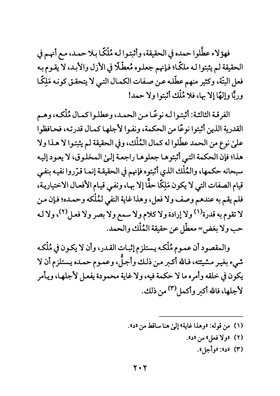فهؤلاء عطَّلوا حمده في الحقيقة، وأثبتوا له مُلْكًا بلا حمد، مع أنهم في الحقيقة لم يثبتوا له ملكًا؛ فإنهم جعلوه مُعطّلًا في الأزل والأبد، لا يقوم به فعل البتّة، وكثير منهم عطّله عن صفات الكمال التي لا يتحقق كونه مَلِكًا وربًّا وإلهًا إلا بها، فلا مُلْك أثبتوا ولا حمد!