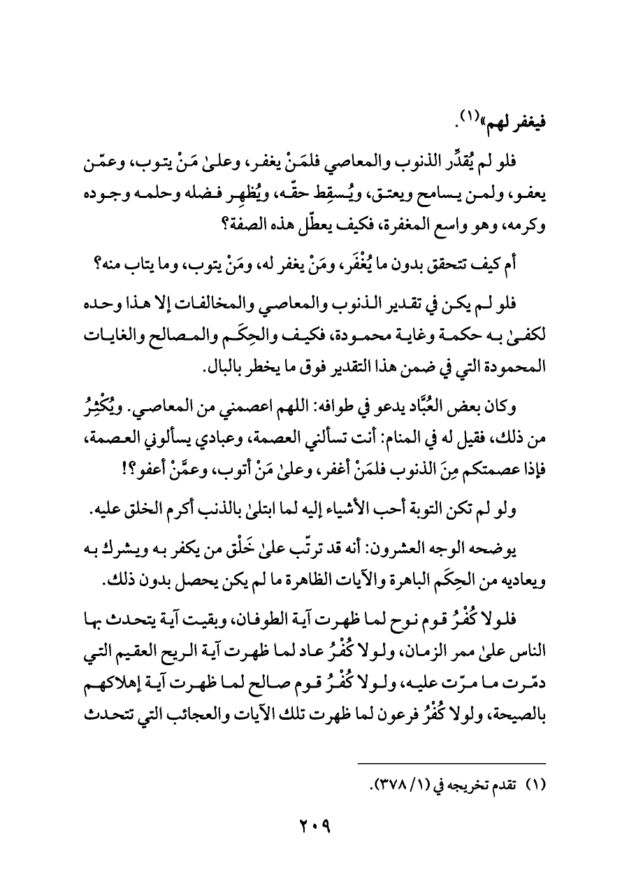 فلو لم يُقدِّر الذنوب والمعاصي فلمَنْ يغفر، وعلى مَنْ يتوب، وعمّن يعفو، ولمن يسامح ويعتق، ويُسقِط حقّه، ويُظهِر فضله وحلمه وجوده وكرمه، وهو واسع المغفرة، فكيف يعطّل هذه الصفة؟