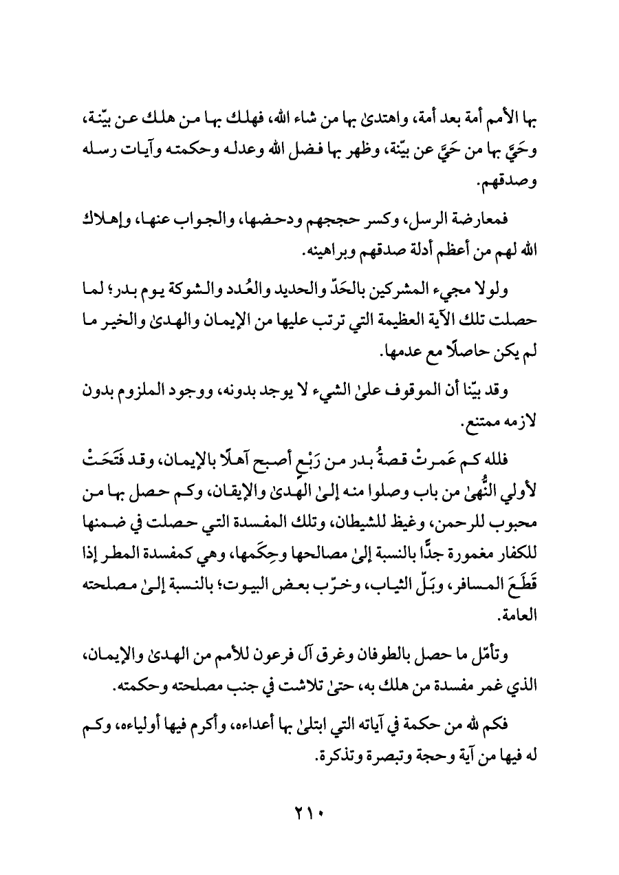 بها الأمم أمة بعد أمة، واهتدى بها من شاء الله، فهلك بها من هلك عن بيّنة، وحَيَّ بها من حَيَّ عن بيّنة، وظهر بها فضل الله وعدله وحكمته وآيات رسله وصدقهم.