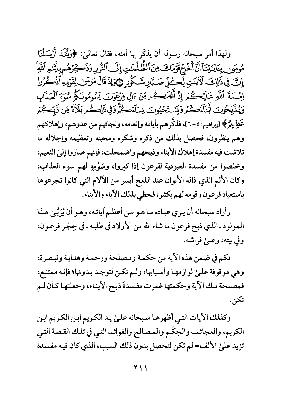 ولهذا أمر سبحانه رسوله أن يذكّر بها أمته، فقال تعالى: {وَلَقَدْ أَرْسَلْنَا مُوسَى بِآيَاتِنَا أَنْ أَخْرِجْ قَوْمَكَ مِنَ الظُّلُمَاتِ إِلَى النُّورِ وَذَكِّرْهُمْ بِأَيَّامِ اللَّهِ إِنَّ فِي ذَلِكَ لَآيَاتٍ لِكُلِّ صَبَّارٍ شَكُورٍ (٥) وَإِذْ قَالَ مُوسَى لِقَوْمِهِ اذْكُرُوا نِعْمَةَ اللَّهِ عَلَيْكُمْ إِذْ أَنْجَاكُمْ مِنْ آلِ فِرْعَوْنَ يَسُومُونَكُمْ سُوءَ الْعَذَابِ وَيُذَبِّحُونَ أَبْنَاءَكُمْ وَيَسْتَحْيُونَ نِسَاءَكُمْ وَفِي ذَلِكُمْ بَلَاءٌ مِنْ رَبِّكُمْ عَظِيمٌ} [إبراهيم: ٥ - ٦]، فذكَّرهم بأيامه وإنعامه، ونجاتهم من عدوهم، وإهلاكهم وهم ينظرون، فحصل بذلك من ذكره وشكره ومحبته وتعظيمه وإجلاله ما تلاشت فيه مفسدة إهلاك الأبناء وذبحهم واضمحلت، فإنهم صاروا إلى النعيم، وخلصوا من مفسدة العبودية لفرعون إذا كبروا، وسَوْمِهِ لهم سوء العذاب، وكان الألم الذي ذاقه الأبوان عند الذبح أيسر من الآلام التي كانوا تجرعوها باستعباد فرعون وقومه لهم بكثير، فحظي بذلك الآباء والأبناء.