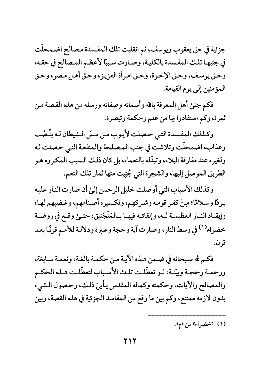 جزئية في حق يعقوب ويوسف، ثم انقلبت تلك المفسدة مصالح اضمحلّت في جنبها تلك المفسدة بالكلية، وصارت سببًا لأعظم المصالح في حقه، وحق يوسف، وحق الإخوة، وحق امرأة العزيز، وحق أهل مصر، وحق المؤمنين إلى يوم القيامة.