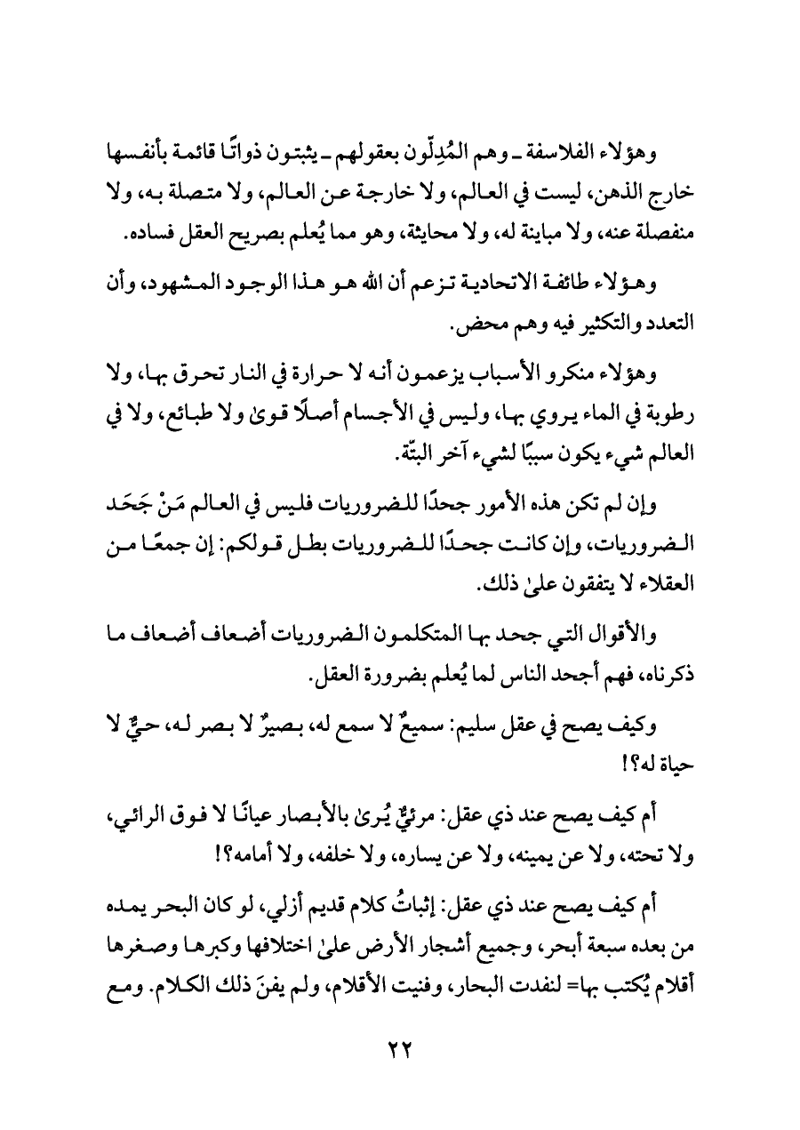 والأقوال التي جحد بها المتكلمون الضروريات أضعاف أضعاف ما ذكرناه، فهم أجحد الناس لما يُعلم بضرورة العقل.