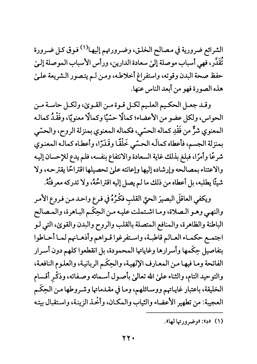 ويكفي العاقلَ البصيرَ الحيَّ القلبِ فكْرُهُ في فرع واحد من فروع الأمر والنهي وهو الصلاة، وما اشتملت عليه من الحِكَم الباهرة، والمصالح الباطنة والظاهرة، والمنافع المتصلة بالقلب والروح والبدن والقوى، التي لو اجتمع حكماء العالم قاطبة، واستفرغوا قواهم وأذهانهم لما أحاطوا بتفاصيل حِكَمها وأسرارها وغاياتها المحمودة، بل انقطعوا كلهم دون أسرار الفاتحة وما فيها من المعارف الإلهية، والحِكَم الربانية، والعلوم النافعة، والتوحيد التام، والثناء على الله تعالى بأصول أسمائه وصفاته، وذكْرِ أقسام الخليقة، باعتبار غاياتهم ووسائلهم، وما في مقدماتها وشروطها من الحِكَم العجيبة: من تطهير الأعضاء والثياب والمكان، وأخْذ الزينة، واستقبال بيته