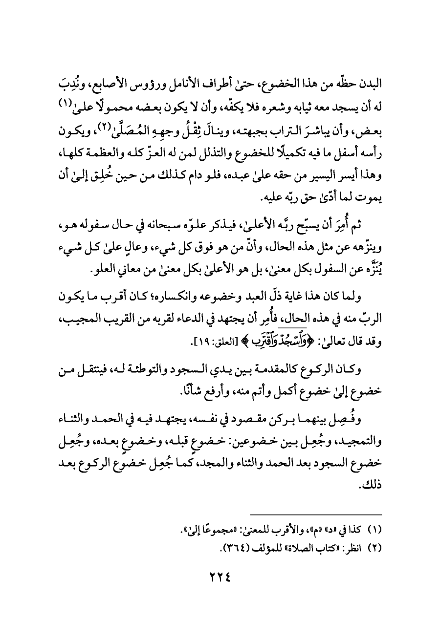 ولما كان هذا غاية ذلّ العبد وخضوعه وانكساره؛ كان أقرب ما يكون الربّ منه في هذه الحال، فأُمِر أن يجتهد في الدعاء لقربه من القريب المجيب، وقد قال تعالى: {تُطِعْهُ وَاسْجُدْ وَاقْتَرِبْ} [العلق: ١٩].