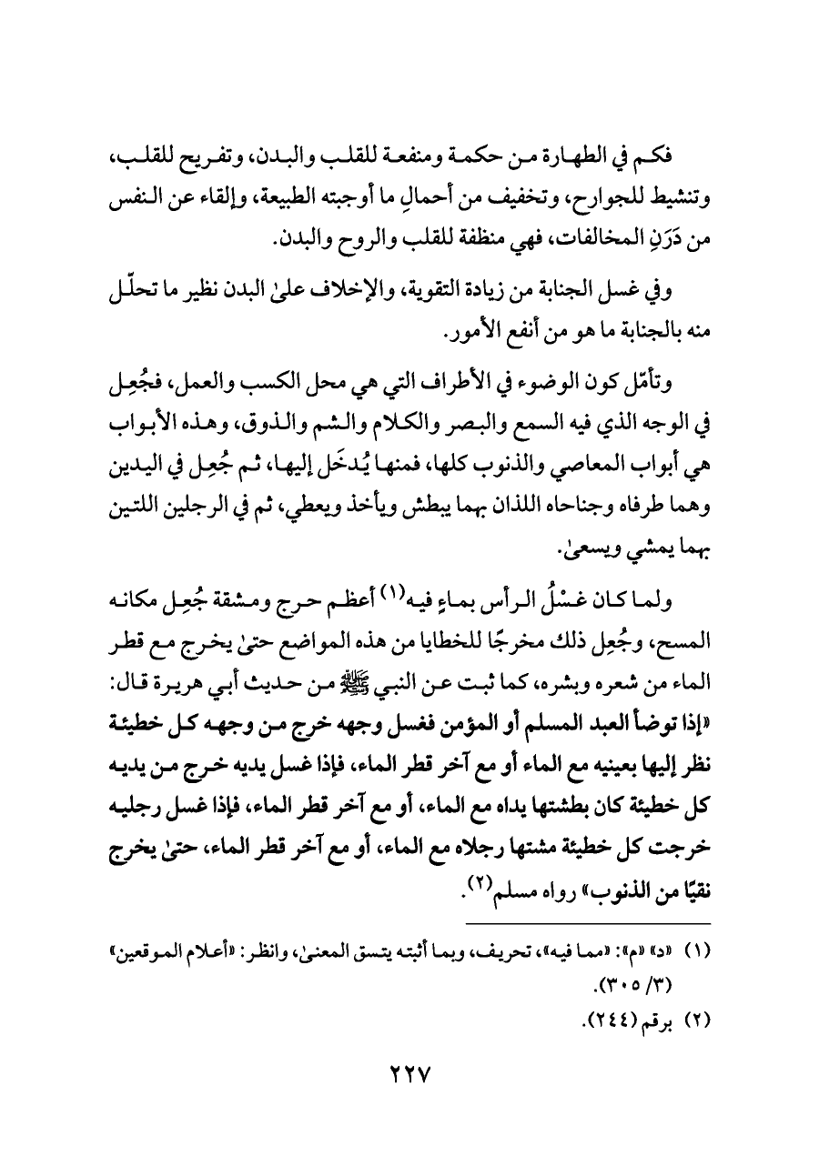 فكم في الطهارة من حكمة ومنفعة للقلب والبدن، وتفريح للقلب، وتنشيط للجوارح، وتخفيف من أحمالِ ما أوجبته الطبيعة، وإلقاء عن النفس من دَرَنِ المخالفات، فهي منظفة للقلب والروح والبدن.