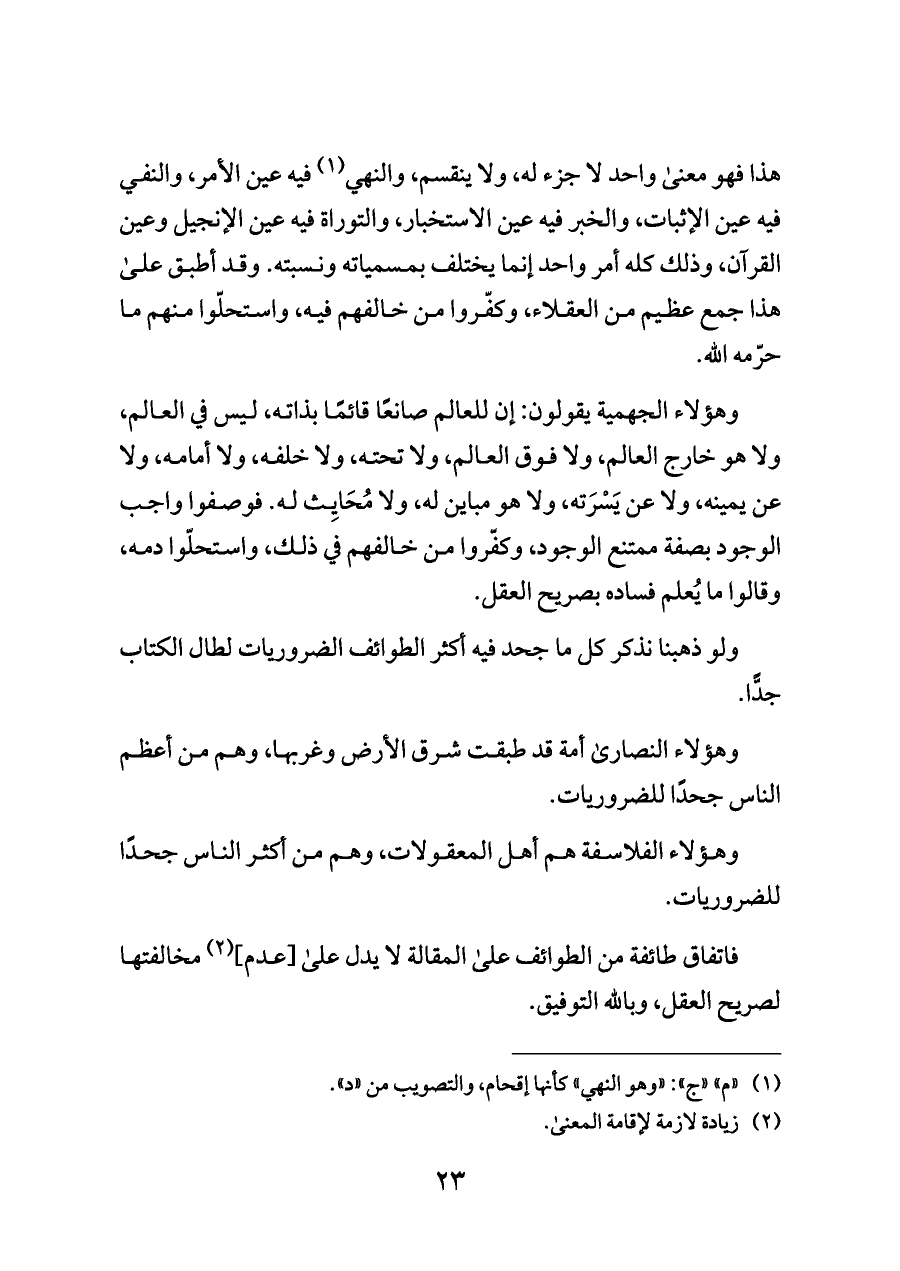 ولو ذهبنا نذكر كل ما جحد فيه أكثر الطوائف الضروريات لطال الكتاب جدًّا.