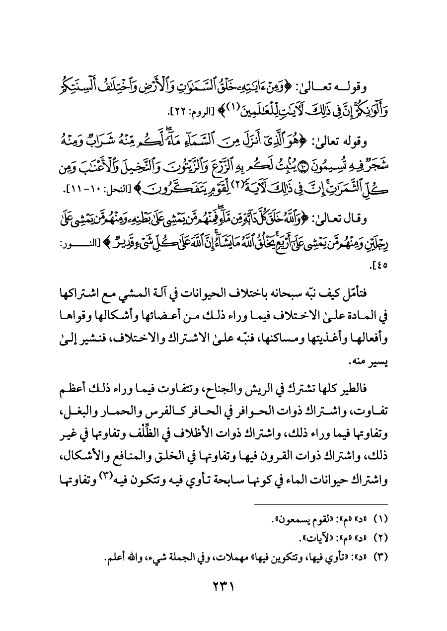 فتأمّل كيف نبّه سبحانه باختلاف الحيوانات في آلة المشي مع اشتراكها في المادة على الاختلاف فيما وراء ذلك من أعضائها وأشكالها وقواها وأفعالها وأغذيتها ومساكنها، فنبّه على الاشتراك والاختلاف، فنشير إلى يسير منه.