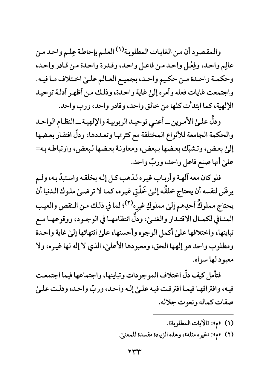 والمقصود أن من الغايات المطلوبة (¬١) العلم بإحاطة عِلم واحد من عالِم واحد، وفِعْل واحد من فاعل واحد، وقدرة واحدة من قادر واحد، وحكمة واحدة من حكيم واحد، بجميع العالم على اختلاف ما فيه. واجتمعت غايات فعله وأمره إلى غاية واحدة، وذلك من أظهر أدلة توحيد الإلهية، كما ابتدأت كلها من خالق واحد، وقادر واحد، ورب واحد.
