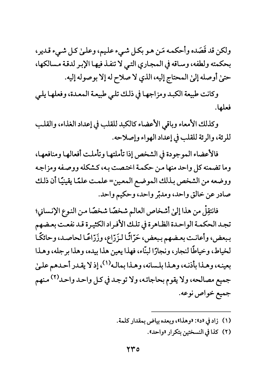 فانتقِلْ من هذا إلى أشخاص العالم شخصًا شخصًا من النوع الإنساني؛ تجد الحكمة الواحدة الظاهرة في تلك الأفراد الكثيرة قد نفعت بعضهم ببعض، وأعانت بعضهم ببعض، حَرّاثًا لزَرّاع، وزَرّاعًا لحاصد، وحائكًا لخياط، وخياطًا لنجار، ونجارًا لبنّاء، فهذا يعين هذا بيده، وهذا برجله، وهذا بعينه، وهذا بأذنه، وهذا بلسانه، وهذا بماله (¬١)، إذ لا يقدر أحدهم على جميع مصالحه، ولا يقوم بحاجاته، ولا توجد في كل واحد واحد (¬٢) منهم جميع خواص نوعه.