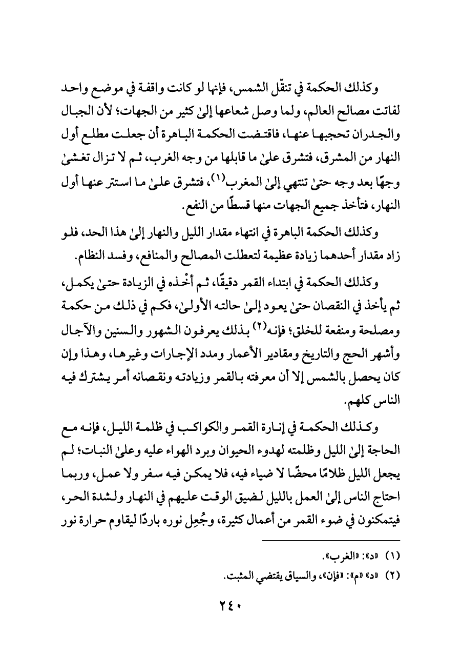 وكذلك الحكمة في تنقّل الشمس، فإنها لو كانت واقفة في موضع واحد لفاتت مصالح العالم، ولما وصل شعاعها إلى كثير من الجهات؛ لأن الجبال والجدران تحجبها عنها، فاقتضت الحكمة الباهرة أن جعلت مطلع أول النهار من المشرق، فتشرق على ما قابلها من وجه الغرب، ثم لا تزال تغشى وجهًا بعد وجه حتى تنتهي إلى المغرب (¬١)، فتشرق على ما استتر عنها أول النهار، فتأخذ جميع الجهات منها قسطًا من النفع.
