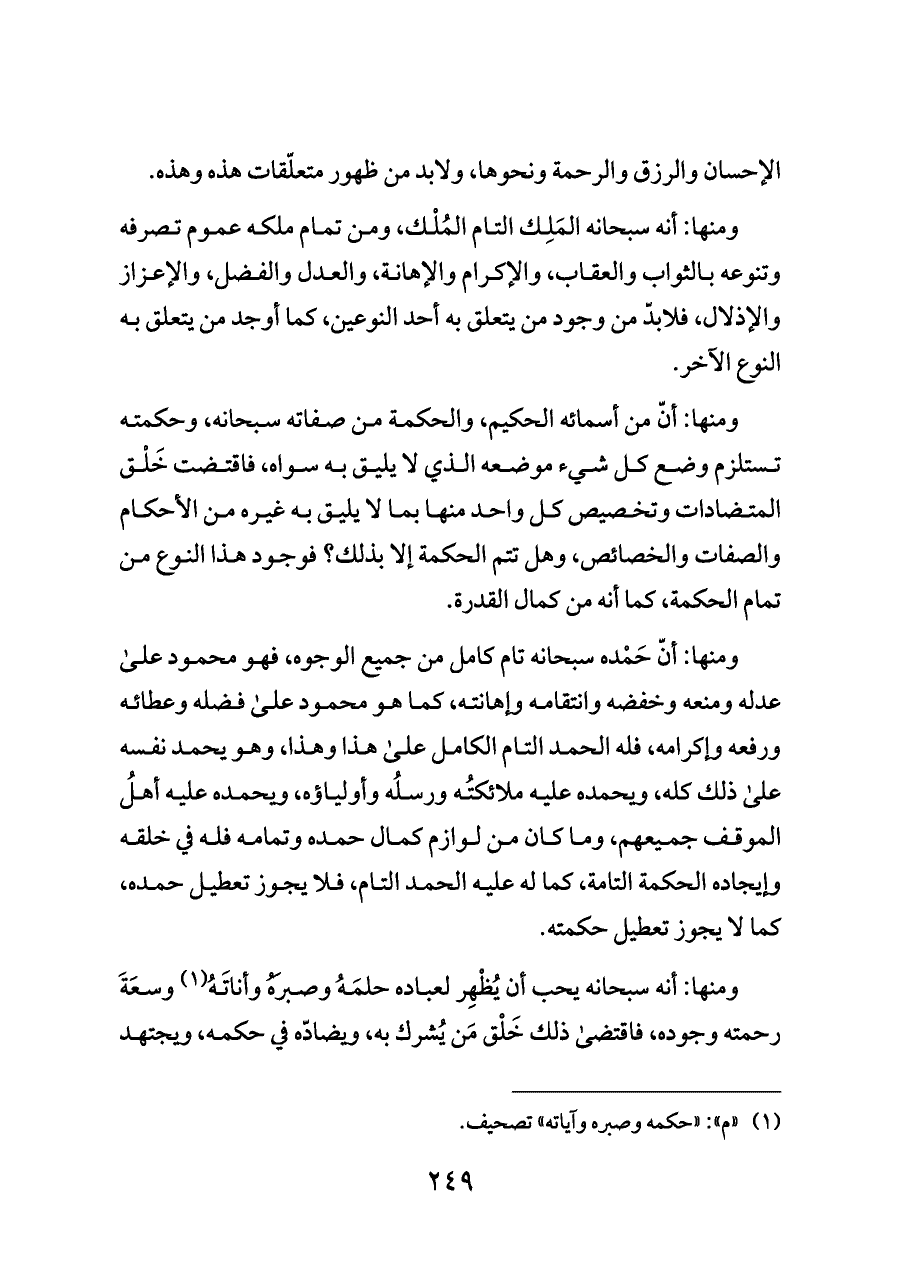 ومنها: أنّ حَمْده سبحانه تام كامل من جميع الوجوه، فهو محمود على عدله ومنعه وخفضه وانتقامه وإهانته، كما هو محمود على فضله وعطائه ورفعه وإكرامه، فله الحمد التام الكامل على هذا وهذا، وهو يحمد نفسه على ذلك كله، ويحمده عليه ملائكتُه ورسلُه وأولياؤه، ويحمده عليه أهلُ الموقف جميعهم، وما كان من لوازم كمال حمده وتمامه فله في خلقه وإيجاده الحكمة التامة، كما له عليه الحمد التام، فلا يجوز تعطيل حمده، كما لا يجوز تعطيل حكمته.