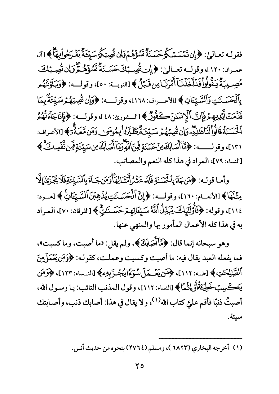 فقوله تعالى: {إِنْ تَمْسَسْكُمْ حَسَنَةٌ تَسُؤْهُمْ وَإِنْ تُصِبْكُمْ سَيِّئَةٌ يَفْرَحُوا بِهَا} [آل عمران: ١٢٠]، وقوله تعالى: {إِنْ تُصِبْكَ حَسَنَةٌ تَسُؤْهُمْ وَإِنْ تُصِبْكَ مُصِيبَةٌ يَقُولُوا قَدْ أَخَذْنَا أَمْرَنَا مِنْ قَبْلُ} [التوبة: ٥٠]، وقوله: {ذَلِكَ وَبَلَوْنَاهُمْ} [الأعراف: ١٦٨]، وقوله: {وَإِنْ تُصِبْهُمْ سَيِّئَةٌ بِمَا قَدَّمَتْ أَيْدِيهِمْ فَإِنَّ الْإِنْسَانَ كَفُورٌ} [الشورى: ٤٨]، وقوله: {فَإِذَا جَاءَتْهُمُ الْحَسَنَةُ قَالُوا لَنَا هَذِهِ وَإِنْ تُصِبْهُمْ سَيِّئَةٌ يَطَّيَّرُوا بِمُوسَى وَمَنْ مَعَهُ} [الأعراف: ١٣١]، وقوله: {مَا أَصَابَكَ مِنْ حَسَنَةٍ فَمِنَ اللَّهِ وَمَا أَصَابَكَ مِنْ سَيِّئَةٍ فَمِنْ نَفْسِكَ} [النساء: ٧٩]، المراد في هذا كله النعم والمصائب.