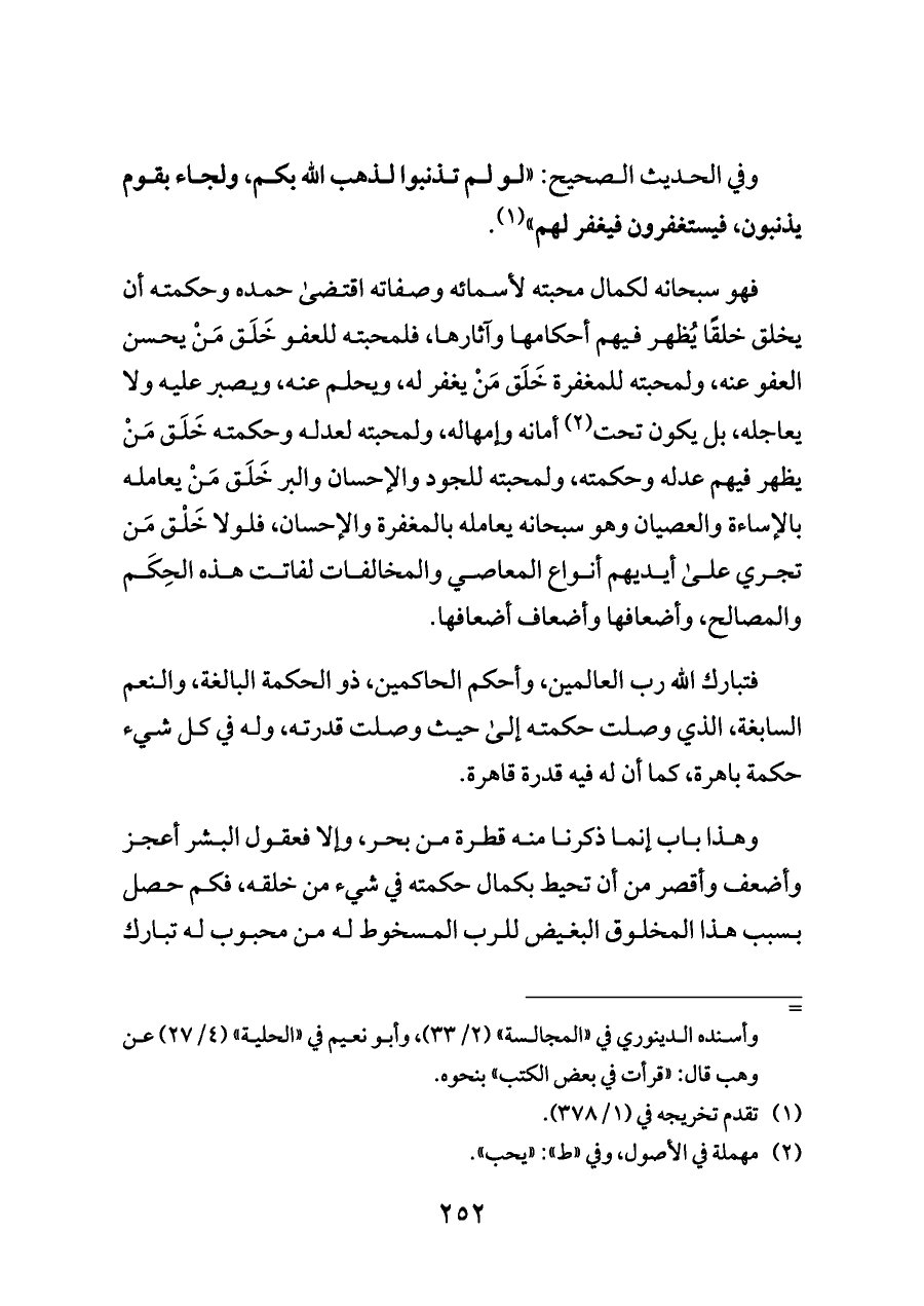 فهو سبحانه لكمال محبته لأسمائه وصفاته اقتضى حمده وحكمته أن يخلق خلقًا يُظهر فيهم أحكامها وآثارها، فلمحبته للعفو خَلَق مَنْ يحسن العفو عنه، ولمحبته للمغفرة خَلَق مَنْ يغفر له، ويحلم عنه، ويصبر عليه ولا يعاجله، بل يكون تحت (¬٢) أمانه وإمهاله، ولمحبته لعدله وحكمته خَلَق مَنْ يظهر فيهم عدله وحكمته، ولمحبته للجود والإحسان والبر خَلَق مَنْ يعامله بالإساءة والعصيان وهو سبحانه يعامله بالمغفرة والإحسان، فلولا خَلْق مَن تجري على أيديهم أنواع المعاصي والمخالفات لفاتت هذه الحِكَم والمصالح، وأضعافها وأضعاف أضعافها.