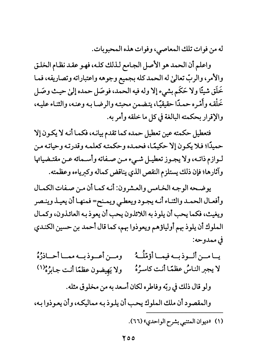 واعلم أن الحمد هو الأصل الجامع لذلك كله، فهو عقد نظام الخلق والأمر، والربّ تعالى له الحمد كله بجميع وجوهه واعتباراته وتصاريفه، فما خَلَق شيئًا ولا حَكَم بشيء إلا وله فيه الحمد، فوصَل حمده إلى حيث وصَل خَلْقه وأَمْره حمدًا حقيقيًا، يتضمن محبته والرضا به وعنه، والثناء عليه، والإقرار بحكمته البالغة في كل ما خلقه وأمر به.