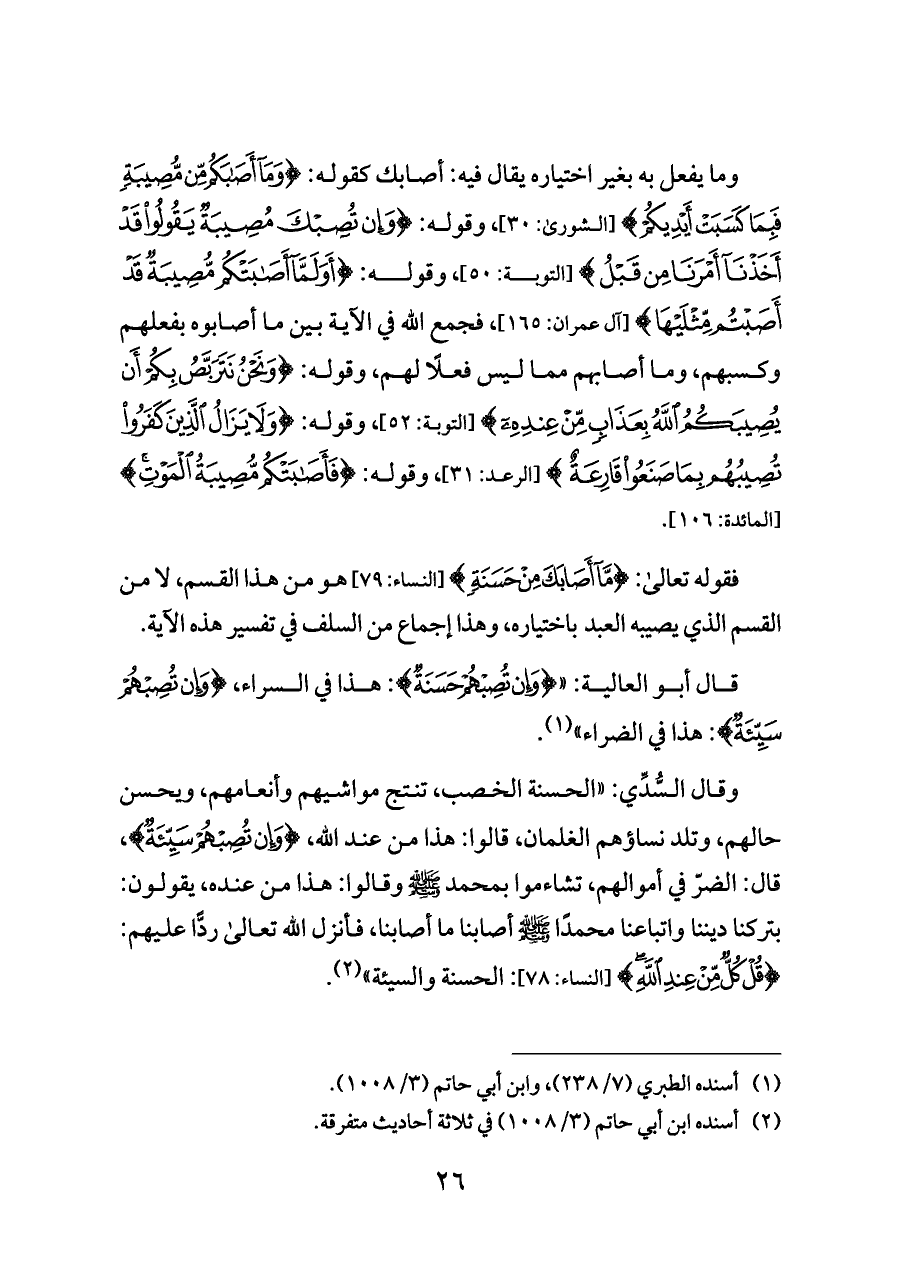 فقوله تعالى: {مَا أَصَابَكَ مِنْ حَسَنَةٍ} [النساء: ٧٩] هو من هذا القسم، لا من القسم الذي يصيبه العبد باختياره، وهذا إجماع من السلف في تفسير هذه الآية.