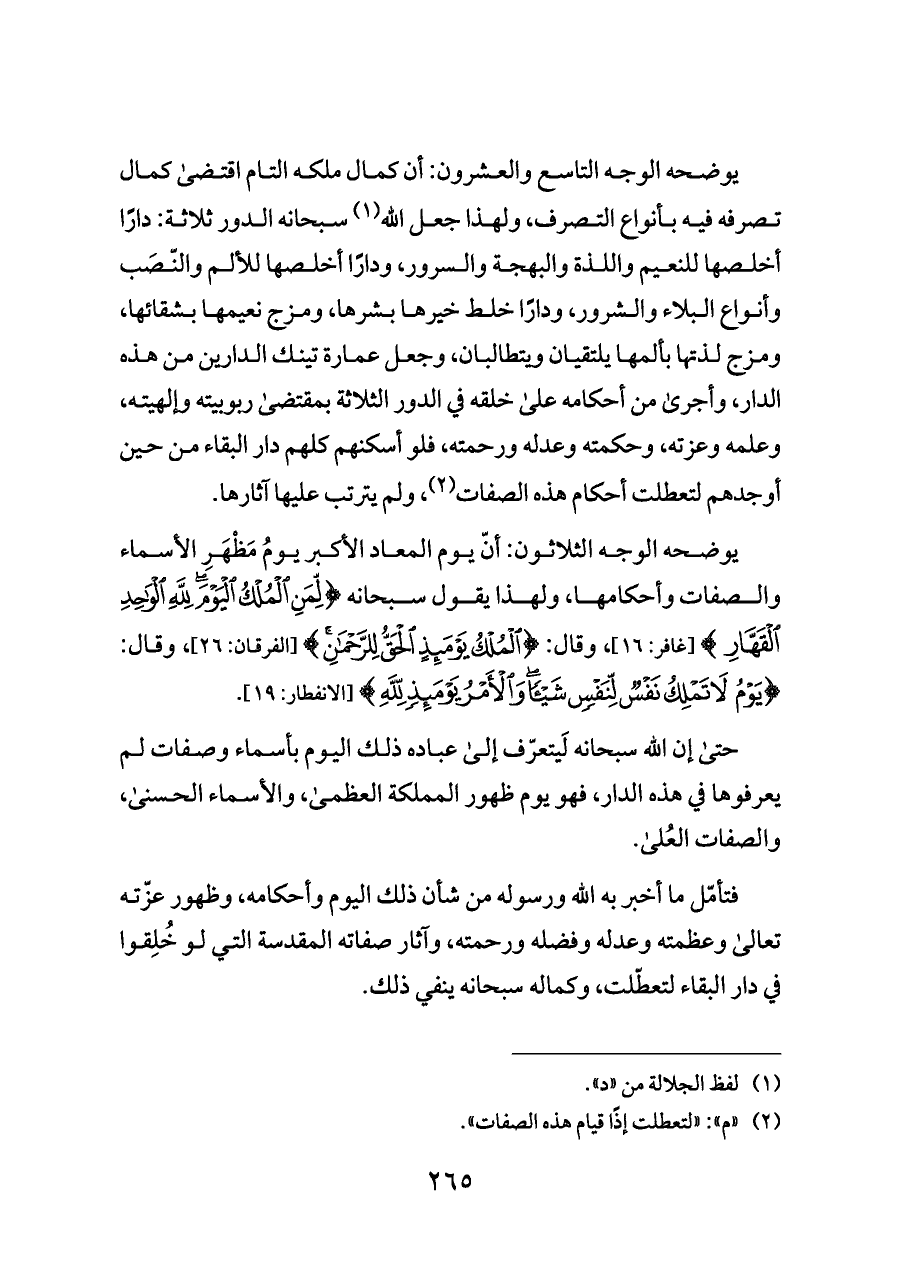 يوضحه الوجه الثلاثون: أنّ يوم المعاد الأكبر يومُ مَظْهَرِ الأسماء والصفات وأحكامها، ولهذا يقول سبحانه {لِمَنِ الْمُلْكُ الْيَوْمَ لِلَّهِ الْوَاحِدِ} [غافر: ١٦]، وقال: {الْمُلْكُ يَوْمَئِذٍ الْحَقُّ لِلرَّحْمَنِ} [الفرقان: ٢٦]، وقال: {يَوْمُ لَا تَمْلِكُ نَفْسٌ لِنَفْسٍ شَيْئًا وَالْأَمْرُ يَوْمَئِذٍ لِلَّهِ} [الانفطار: ١٩].