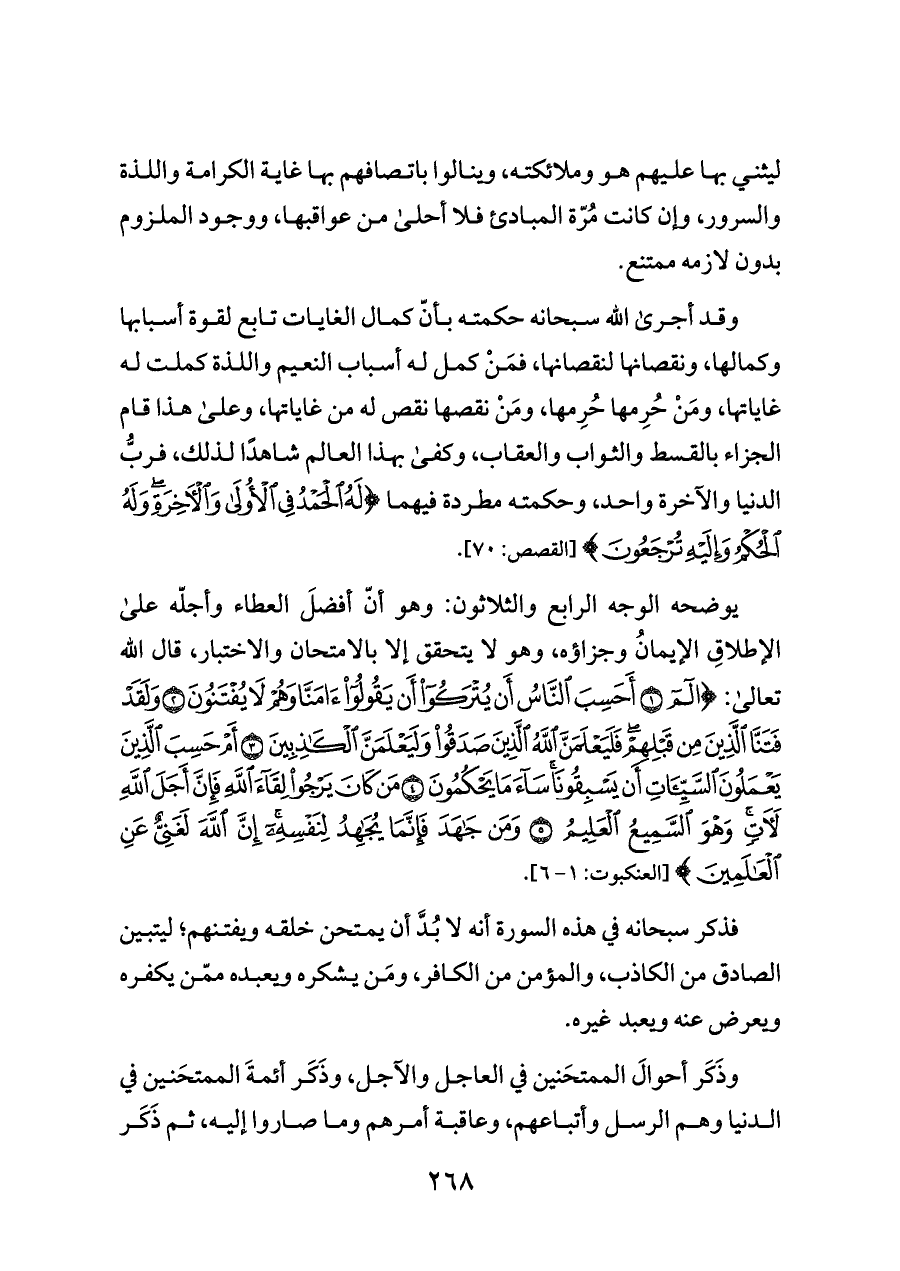 يوضحه الوجه الرابع والثلاثون: وهو أنّ أفضلَ العطاء وأجلّه على الإطلاقِ الإيمانُ وجزاؤه، وهو لا يتحقق إلا بالامتحان والاختبار، قال الله تعالى: {الم (١) أَحَسِبَ النَّاسُ أَنْ يُتْرَكُوا أَنْ يَقُولُوا آمَنَّا وَهُمْ لَا يُفْتَنُونَ (٢) وَلَقَدْ فَتَنَّا الَّذِينَ مِنْ قَبْلِهِمْ فَلَيَعْلَمَنَّ اللَّهُ الَّذِينَ صَدَقُوا وَلَيَعْلَمَنَّ الْكَاذِبِينَ (٣) أَمْ حَسِبَ الَّذِينَ يَعْمَلُونَ السَّيِّئَاتِ أَنْ يَسْبِقُونَا سَاءَ مَا يَحْكُمُونَ (٤) مَنْ كَانَ يَرْجُو لِقَاءَ اللَّهِ فَإِنَّ أَجَلَ اللَّهِ لَآتٍ وَهْوَ السَّمِيعُ الْعَلِيمُ (٥) وَمَنْ جَاهَدَ فَإِنَّمَا يُجَاهِدُ لِنَفْسِهِ إِنَّ اللَّهَ لَغَنِيٌّ عَنِ الْعَالَمِينَ} [العنكبوت: ١ - ٦].