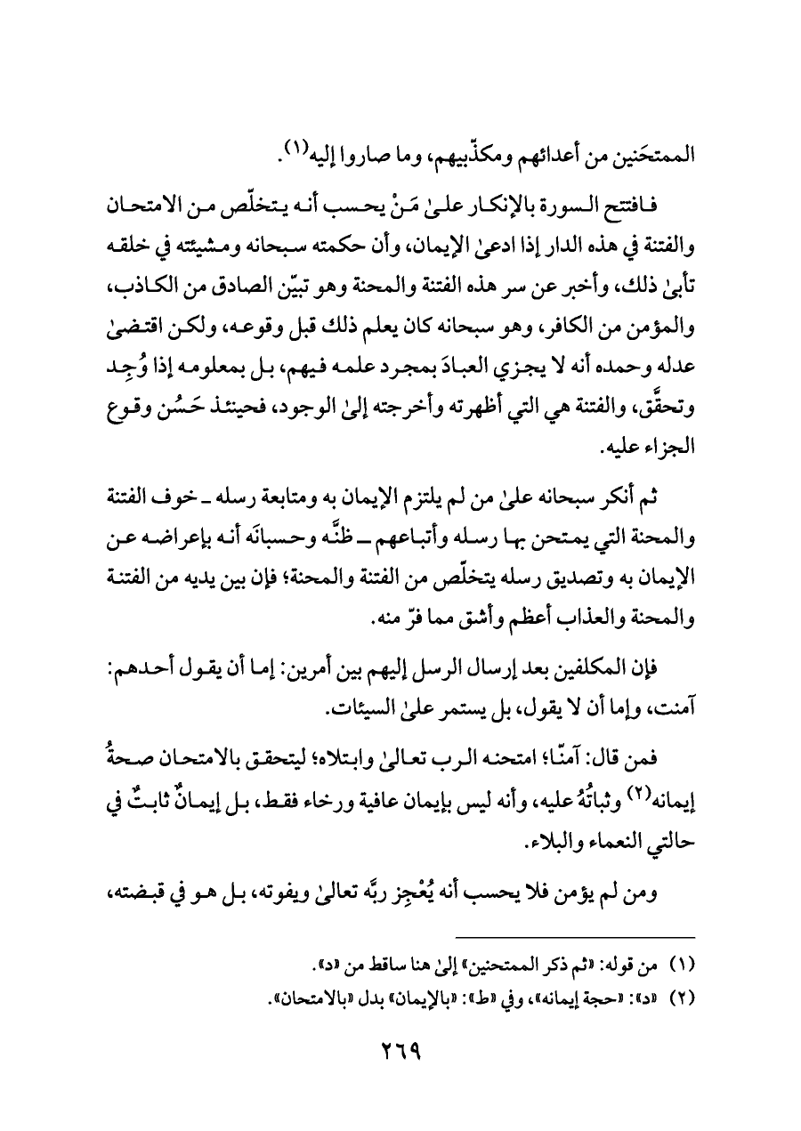 (¬٢) «د»: «حجة إيمانه»، وفي «ط»: «بالإيمان» بدل «بالامتحان».