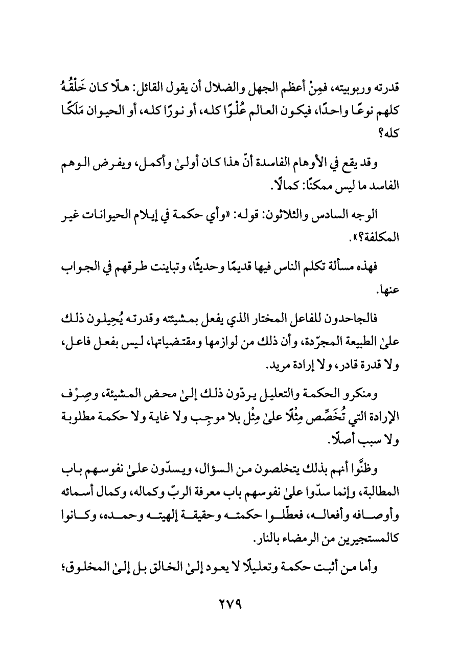 ومنكرو الحكمة والتعليل يردّون ذلك إلى محض المشيئة، وصِرْف الإرادة التي تُخَصِّص مِثْلًا على مِثْل بلا موجِب ولا غاية ولا حكمة مطلوبة ولا سبب أصلًا.