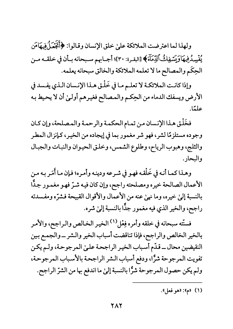 فخَلْق هذا الإنسان من تمام الحكمة والرحمة والمصلحة، وإن كان وجوده مستلزمًا لشر، فهو شر مغمور بما في إيجاده من الخير، كإنزال المطر والثلج، وهبوب الرياح، وطلوع الشمس، وخلق الحيوان والنبات والجبال والبحار.