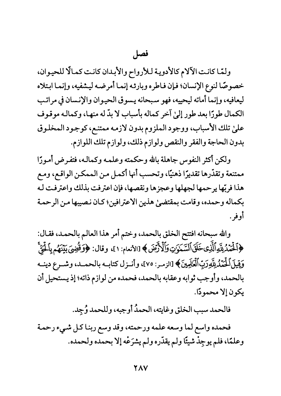 والله سبحانه افتتح الخلق بالحمد، وختم أمر هذا العالم بالحمد، فقال: {الْحَمْدُ لِلَّهِ الَّذِي خَلَقَ السَّمَاوَاتِ وَالْأَرْضَ} [الأنعام: ١]، وقال: {وَقُضِيَ بَيْنَهُمْ بِالْحَقِّ وَقِيلَ الْحَمْدُ لِلَّهِ رَبِّ الْعَالَمِينَ (٧٥)} [الزمر: ٧٥]، وأنزل كتابه بالحمد، وشرع دينه بالحمد، وأوجب ثوابه وعقابه بالحمد، فحمده من لوازم ذاته؛ إذ يستحيل أن يكون إلا محمودًا.