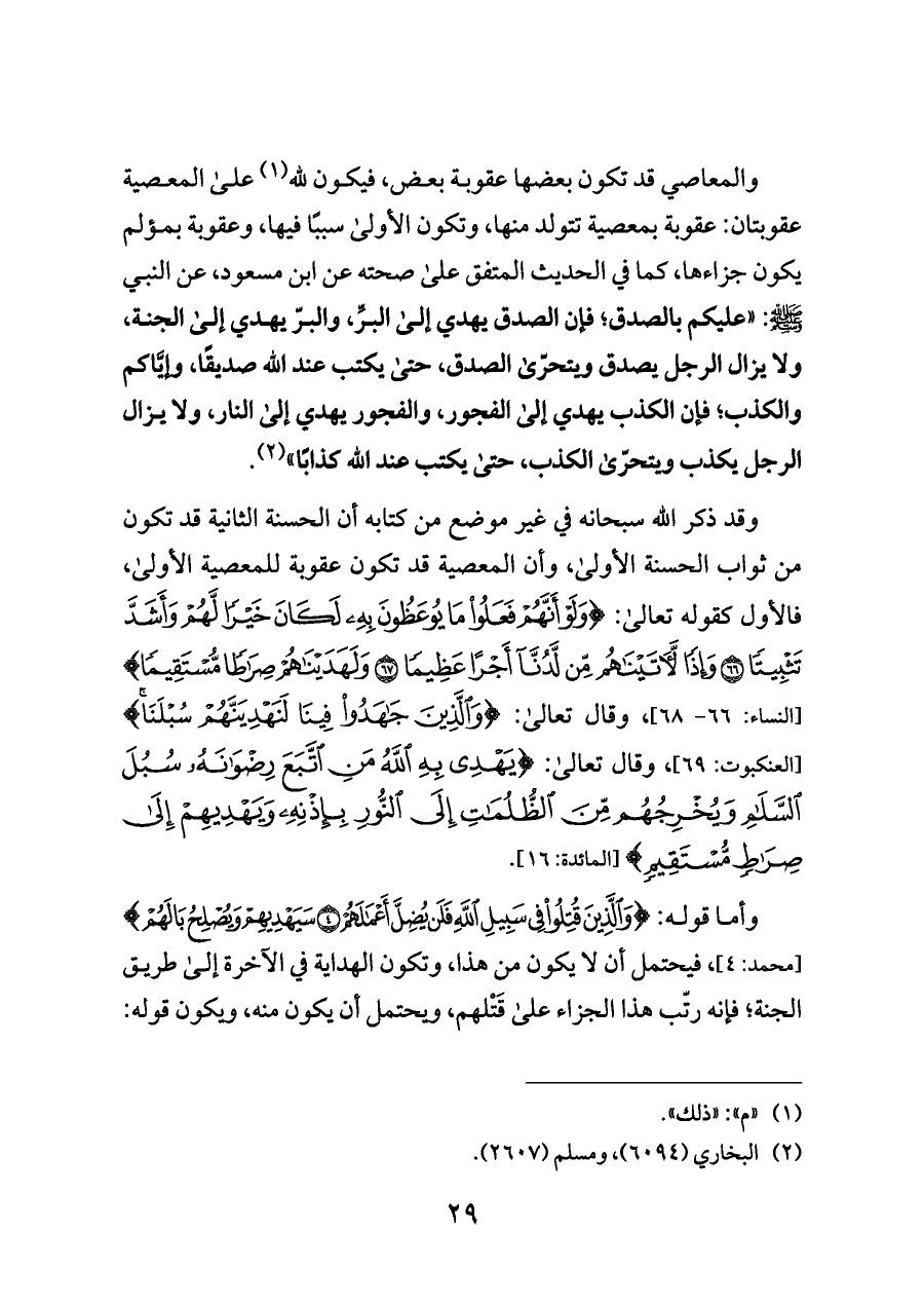 والمعاصي قد تكون بعضها عقوبة بعض، فيكون لله (¬١) على المعصية عقوبتان: عقوبة بمعصية تتولد منها، وتكون الأولى سببًا فيها، وعقوبة بمؤلم يكون جزاءها، كما في الحديث المتفق على صحته عن ابن مسعود، عن النبي - صلى الله عليه وسلم -: «عليكم بالصدق؛ فإن الصدق يهدي إلى البرِّ، والبرّ يهدي إلى الجنة، ولا يزال الرجل يصدق ويتحرّى الصدق، حتى يكتب عند الله صديقًا، وإيَّاكم والكذب؛ فإن الكذب يهدي إلى الفجور، والفجور يهدي إلى النار، ولا يزال الرجل يكذب ويتحرّى الكذب، حتى يكتب عند الله كذابًا» (¬٢).