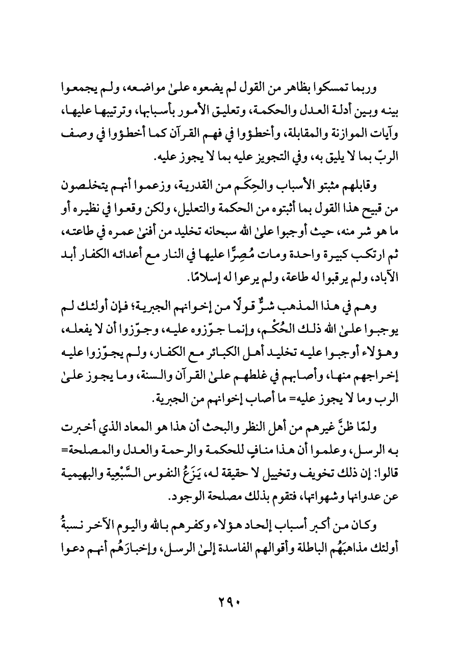 وقابلهم مثبتو الأسباب والحِكَم من القدرية، وزعموا أنهم يتخلصون من قبيح هذا القول بما أثبتوه من الحكمة والتعليل، ولكن وقعوا في نظيره أو ما هو شر منه، حيث أوجبوا على الله سبحانه تخليد من أفنى عمره في طاعته، ثم ارتكب كبيرة واحدة ومات مُصِرًّا عليها في النار مع أعدائه الكفار أبد الآباد، ولم يرقبوا له طاعة، ولم يرعوا له إسلامًا.