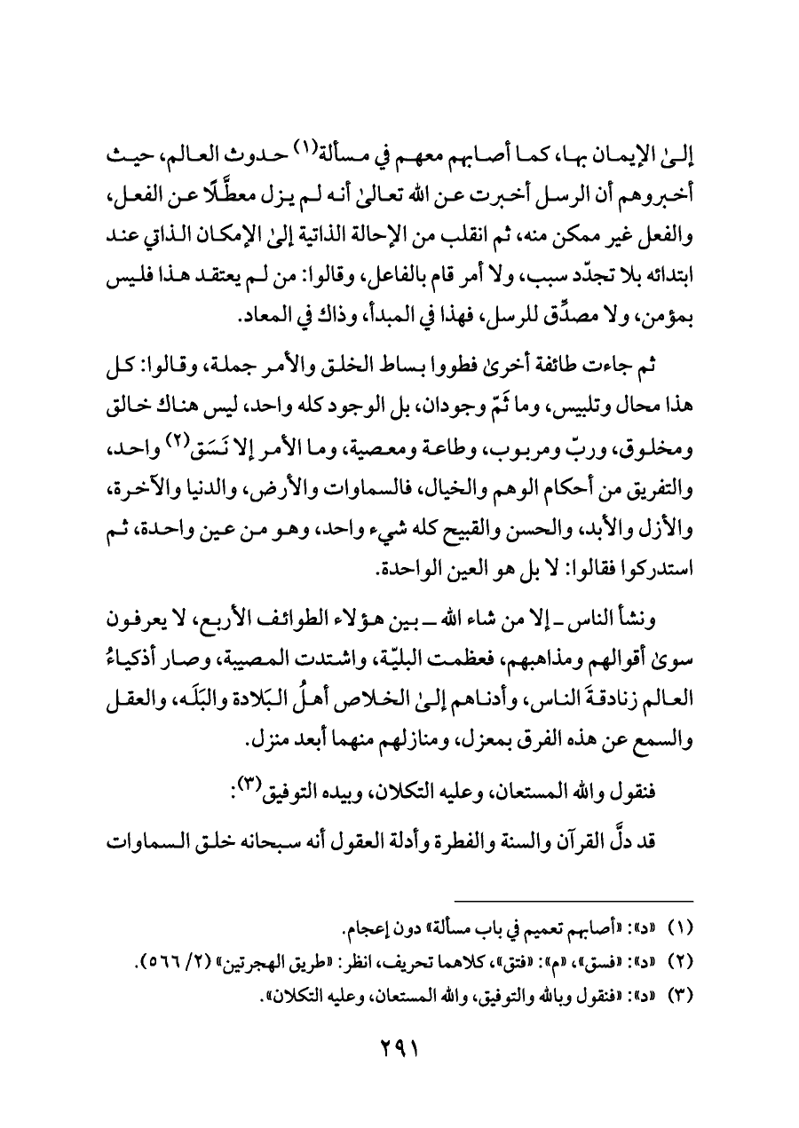 إلى الإيمان بها، كما أصابهم معهم في مسألة (¬١) حدوث العالم، حيث أخبروهم أن الرسل أخبرت عن الله تعالى أنه لم يزل معطَّلًا عن الفعل، والفعل غير ممكن منه، ثم انقلب من الإحالة الذاتية إلى الإمكان الذاتي عند ابتدائه بلا تجدّد سبب، ولا أمر قام بالفاعل، وقالوا: من لم يعتقد هذا فليس بمؤمن، ولا مصدِّق للرسل، فهذا في المبدأ، وذاك في المعاد.