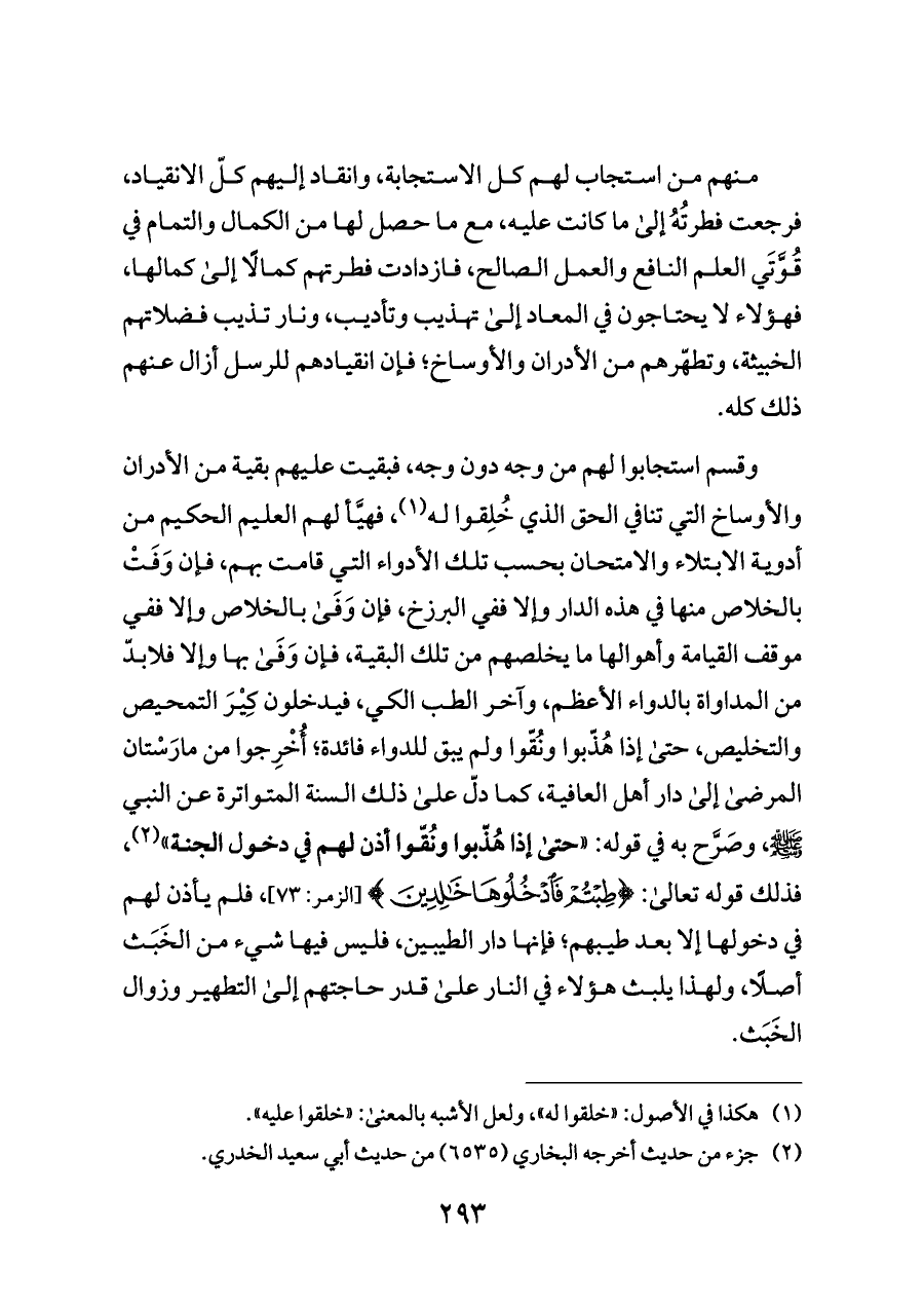 منهم من استجاب لهم كل الاستجابة، وانقاد إليهم كلّ الانقياد، فرجعت فطرتُهُ إلى ما كانت عليه، مع ما حصل لها من الكمال والتمام في قُوَّتَي العلم النافع والعمل الصالح، فازدادت فطرتهم كمالًا إلى كمالها، فهؤلاء لا يحتاجون في المعاد إلى تهذيب وتأديب، ونار تذيب فضلاتهم الخبيثة، وتطهّرهم من الأدران والأوساخ؛ فإن انقيادهم للرسل أزال عنهم ذلك كله.