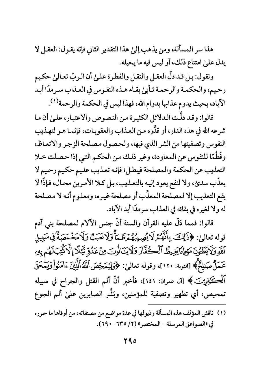 ونقول: بل قد دلّ العقل والنقل والفطرة على أن الربّ تعالى حكيم رحيم، والحكمة والرحمة تأبى بقاء هذه النفوس في العذاب سرمدًا أبد الآباد، بحيث يدوم عذابها بدوام الله، فهذا ليس في الحكمة والرحمة (¬١).