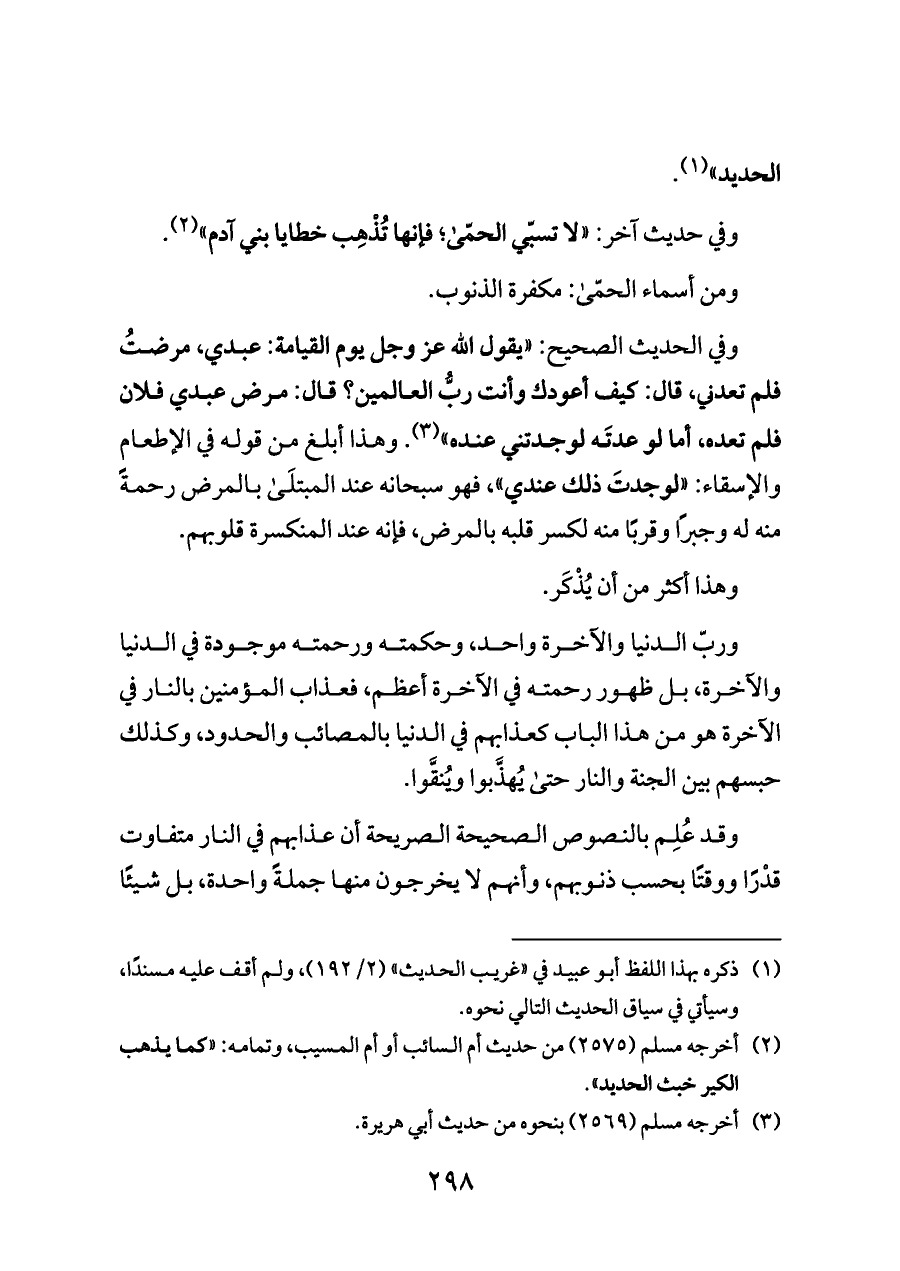 وربّ الدنيا والآخرة واحد، وحكمته ورحمته موجودة في الدنيا والآخرة، بل ظهور رحمته في الآخرة أعظم، فعذاب المؤمنين بالنار في الآخرة هو من هذا الباب كعذابهم في الدنيا بالمصائب والحدود، وكذلك حبسهم بين الجنة والنار حتى يُهذَّبوا ويُنقَّوا.