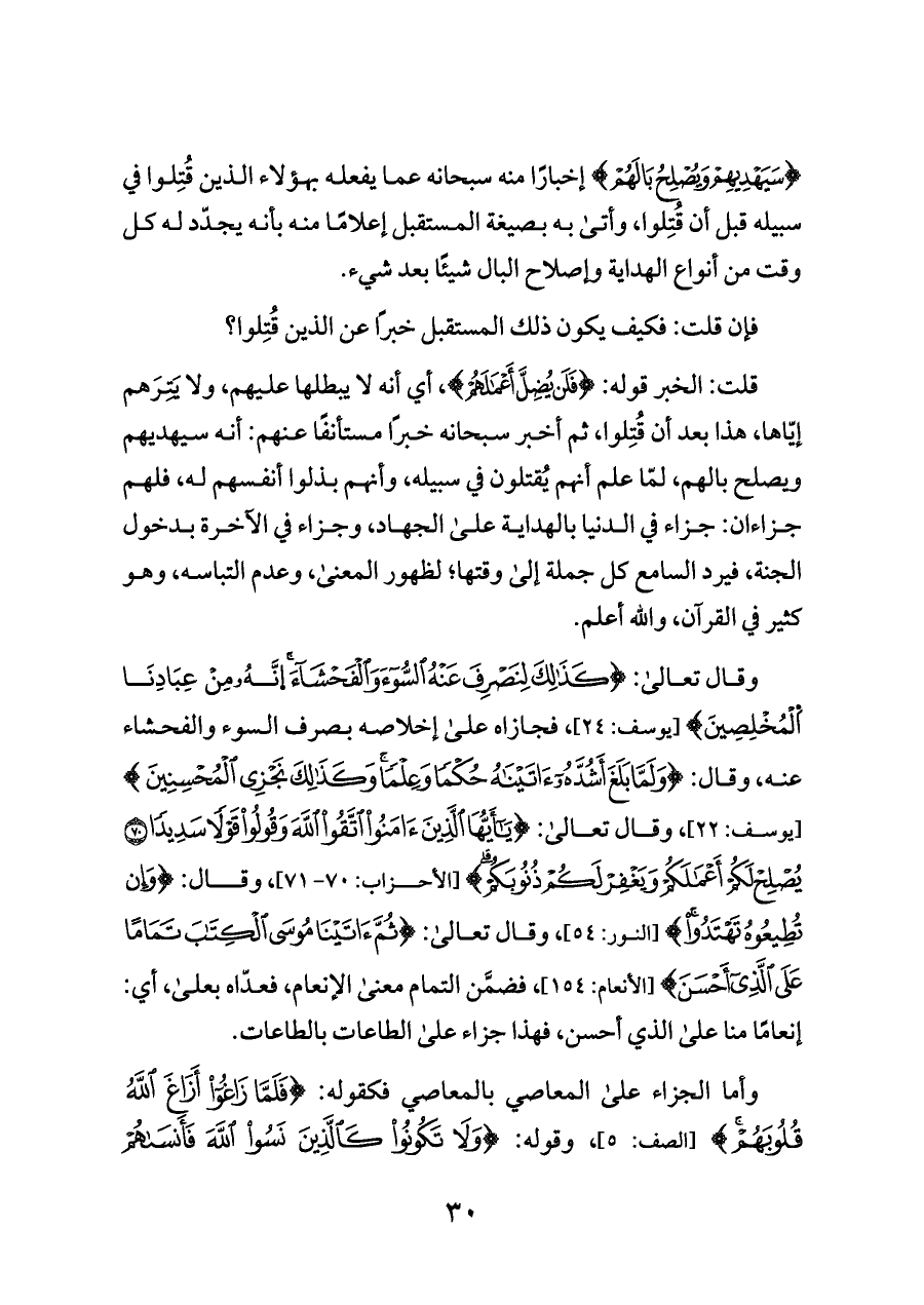 وقال تعالى: {كَذَلِكَ لِنَصْرِفَ عَنْهُ السُّوءَ وَالْفَحْشَاءَ إِنَّهُ مِنْ عِبَادِنَا اَلْمُخْلِصِينَ} [يوسف: ٢٤]، فجازاه على إخلاصه بصرف السوء والفحشاء عنه، وقال: {وَلَمَّا بَلَغَ أَشُدَّهُ آتَيْنَاهُ حُكْمًا وَعِلْمًا وَكَذَلِكَ نَجْزِي الْمُحْسِنِينَ} [يوسف: ٢٢]، وقال تعالى: {يَاأَيُّهَا الَّذِينَ آمَنُوا اتَّقُوا اللَّهَ وَقُولُوا قَوْلًا سَدِيدًا (٧٠) يُصْلِحْ لَكُمْ أَعْمَالَكُمْ وَيَغْفِرْ لَكُمْ ذُنُوبَكُمْ} [الأحزاب: ٧٠ - ٧١]، وقال: {وَإِنْ تُطِيعُوهُ تَهْتَدُوا} [النور: ٥٤]، وقال تعالى: {ثُمَّ آتَيْنَا مُوسَى الْكِتَابَ تَمَامًا عَلَى الَّذِي أَحْسَنَ} [الأنعام: ١٥٤]، فضمَّن التمام معنى الإنعام، فعدّاه بعلى، أي: إنعامًا منا على الذي أحسن، فهذا جزاء على الطاعات بالطاعات.