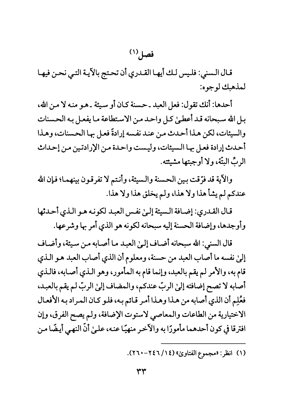 قال السني: الله سبحانه أضاف إلى العبد ما أصابه من سيئة، وأضاف إلى نفسه ما أصاب العبد من حسنة، ومعلوم أن الذي أصاب العبد هو الذي قام به، والأمر لم يقم بالعبد، وإنما قام به المأمور، وهو الذي أصابه، فالذي أصابه لا تصح إضافته إلى الربّ عندكم، والمضاف إلى الربّ لم يقم بالعبد، فعُلِم أن الذي أصابه من هذا وهذا أمر قائم به، فلو كان المراد به الأفعال الاختيارية من الطاعات والمعاصي لاستوت الإضافة، ولم يصح الفرق، وإن افترقا في كون أحدهما مأمورًا به والآخر منهيًا عنه، على أنّ النهي أيضًا من