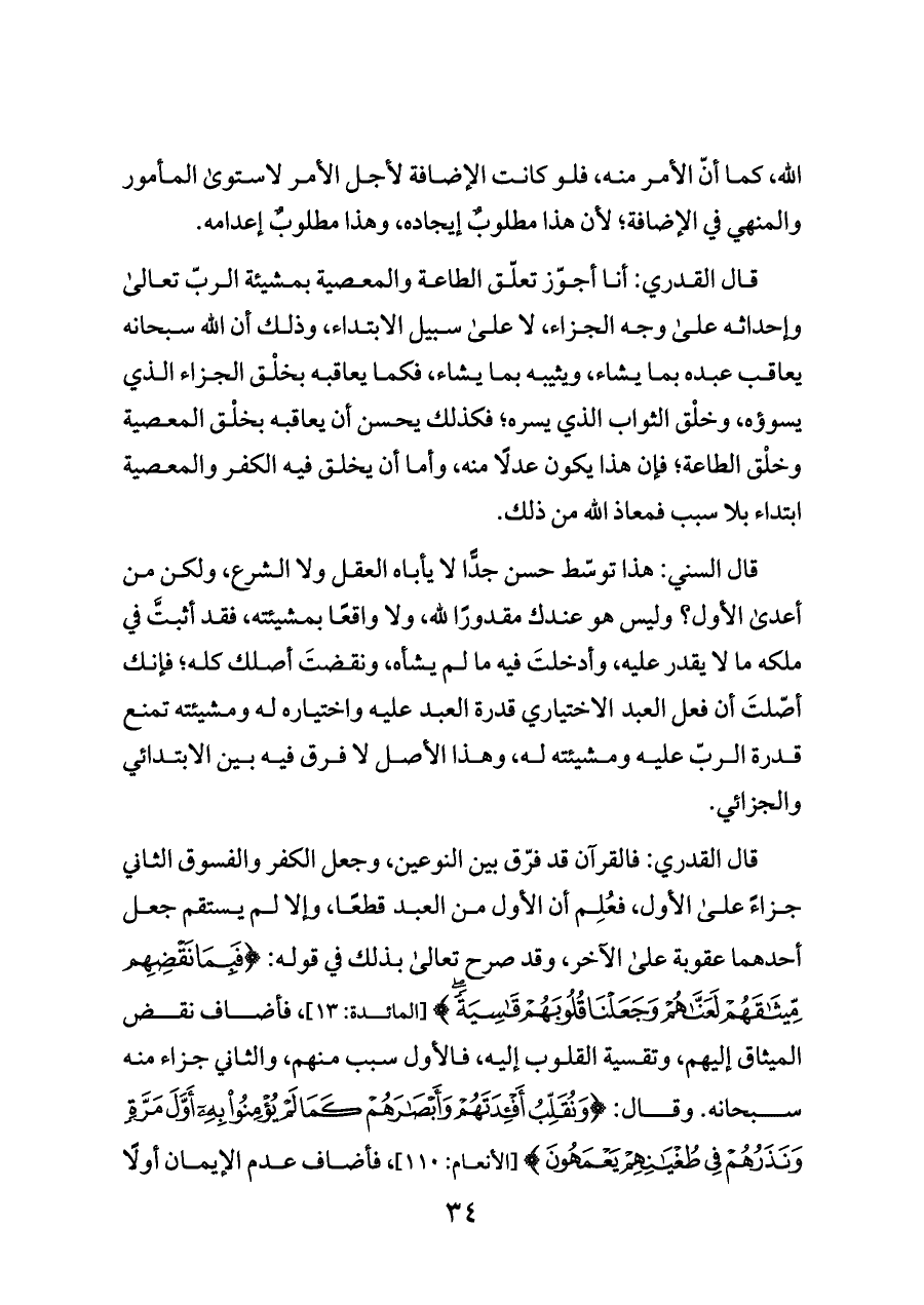 قال القدري: أنا أجوّز تعلّق الطاعة والمعصية بمشيئة الربّ تعالى وإحداثه على وجه الجزاء، لا على سبيل الابتداء، وذلك أن الله سبحانه يعاقب عبده بما يشاء، ويثيبه بما يشاء، فكما يعاقبه بخلْق الجزاء الذي يسوؤه، وخلْق الثواب الذي يسره؛ فكذلك يحسن أن يعاقبه بخلْق المعصية وخلْق الطاعة؛ فإن هذا يكون عدلًا منه، وأما أن يخلق فيه الكفر والمعصية ابتداء بلا سبب فمعاذ الله من ذلك.