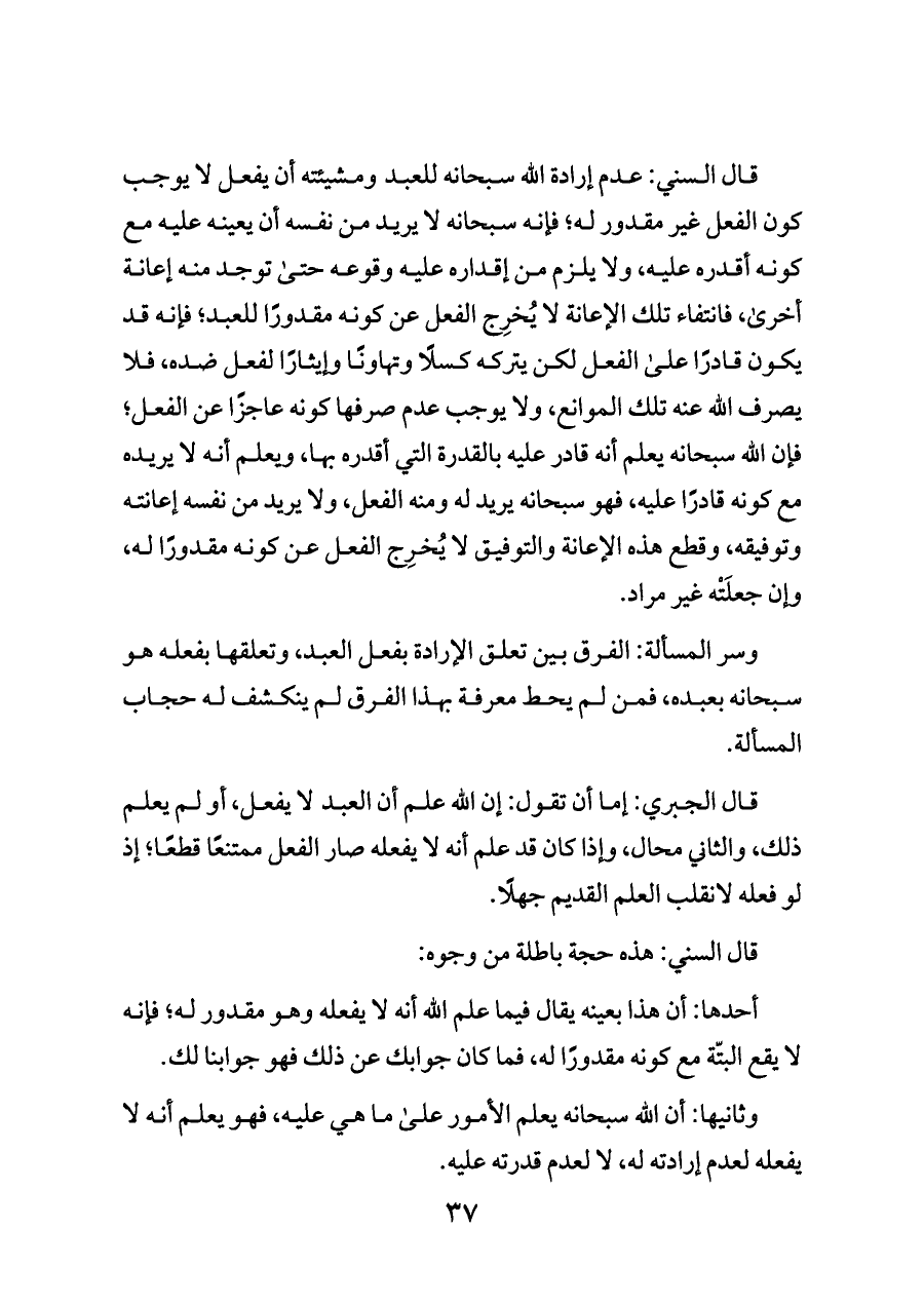 قال السني: عدم إرادة الله سبحانه للعبد ومشيئته أن يفعل لا يوجب كون الفعل غير مقدور له؛ فإنه سبحانه لا يريد من نفسه أن يعينه عليه مع كونه أقدره عليه، ولا يلزم من إقداره عليه وقوعه حتى توجد منه إعانة أخرى، فانتفاء تلك الإعانة لا يُخرِج الفعل عن كونه مقدورًا للعبد؛ فإنه قد يكون قادرًا على الفعل لكن يتركه كسلًا وتهاونًا وإيثارًا لفعل ضده، فلا يصرف الله عنه تلك الموانع، ولا يوجب عدم صرفها كونه عاجزًا عن الفعل؛ فإن الله سبحانه يعلم أنه قادر عليه بالقدرة التي أقدره بها، ويعلم أنه لا يريده مع كونه قادرًا عليه، فهو سبحانه يريد له ومنه الفعل، ولا يريد من نفسه إعانته وتوفيقه، وقطع هذه الإعانة والتوفيق لا يُخرِج الفعل عن كونه مقدورًا له، وإن جعلَتْه غير مراد.