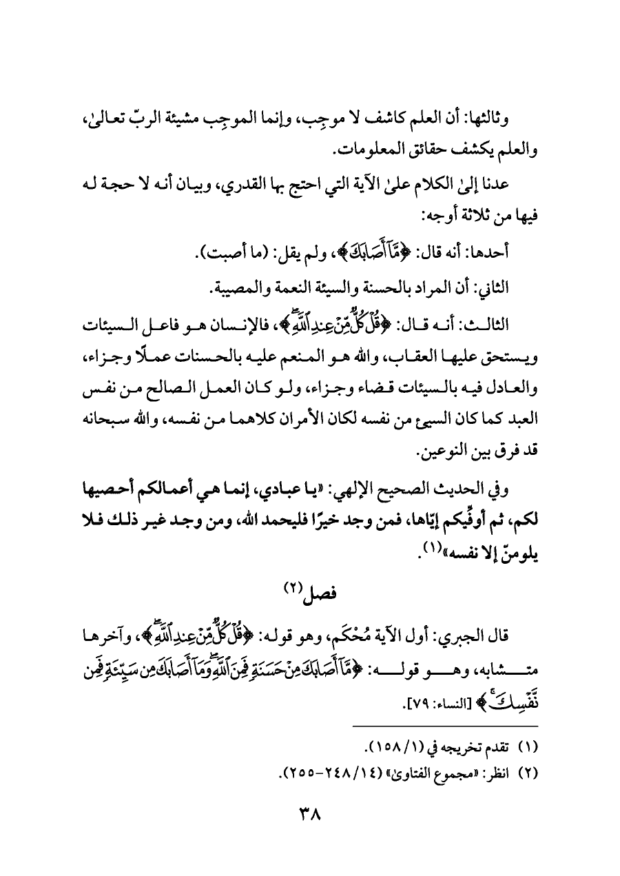 الثالث: أنه قال: {قُلْ كُلٌّ مِنْ عِنْدِ اللَّهِ}، فالإنسان هو فاعل السيئات ويستحق عليها العقاب، والله هو المنعم عليه بالحسنات عملًا وجزاء، والعادل فيه بالسيئات قضاء وجزاء، ولو كان العمل الصالح من نفس العبد كما كان السيئ من نفسه لكان الأمران كلاهما من نفسه، والله سبحانه قد فرق بين النوعين.