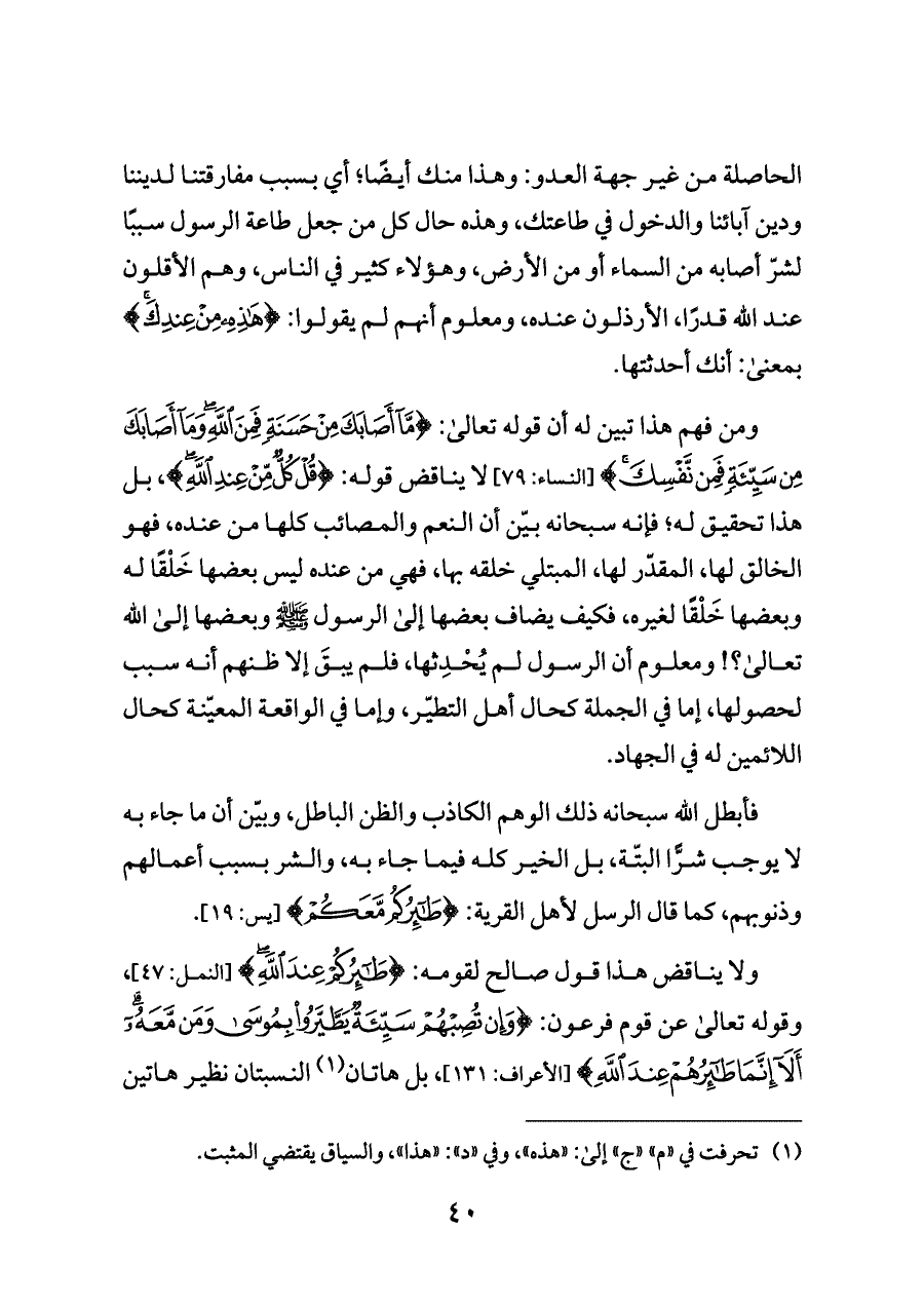 ومن فهم هذا تبين له أن قوله تعالى: {مَا أَصَابَكَ مِنْ حَسَنَةٍ فَمِنَ اللَّهِ وَمَا أَصَابَكَ مِنْ سَيِّئَةٍ فَمِنْ نَفْسِكَ} [النساء: ٧٩] لا يناقض قوله: {قُلْ كُلٌّ مِنْ عِنْدِ اللَّهِ}، بل هذا تحقيق له؛ فإنه سبحانه بيّن أن النعم والمصائب كلها من عنده، فهو الخالق لها، المقدّر لها، المبتلي خلقه بها، فهي من عنده ليس بعضها خَلْقًا له وبعضها خَلْقًا لغيره، فكيف يضاف بعضها إلى الرسول - صلى الله عليه وسلم - وبعضها إلى الله تعالى؟! ومعلوم أن الرسول لم يُحْدِثها، فلم يبقَ إلا ظنهم أنه سبب لحصولها، إما في الجملة كحال أهل التطيّر، وإما في الواقعة المعيّنة كحال اللائمين له في الجهاد.