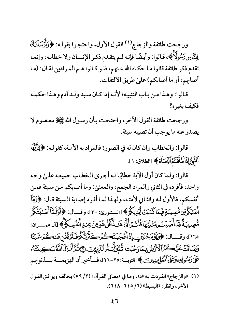 ورجحت طائفة والزجاج (¬١) القول الأول، واحتجوا بقوله: {وَأَرْسَلْنَاكَ لِلنَّاسِ رَسُولًا}، قالوا: وأيضًا فإنه لم يتقدم ذكر الإنسان ولا خطابه، وإنما تقدم ذكر طائفة قالوا ما حكاه الله عنهم، فلو كانوا هم المرادين لقال: (ما أصابهم، أو ما أصابكم) على طريق الالتفات.