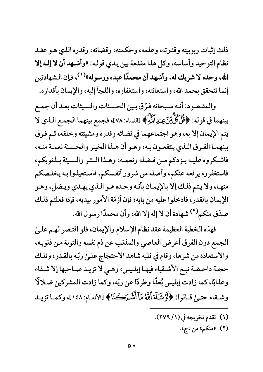 فهذه الخطبة العظيمة عقد نظام الإسلام والإيمان، فلو اقتصر لهم على الجمع دون الفرق أعرض العاصي والمذنب عن ذم نفسه والتوبة من ذنوبه، والاستعاذة من شرها، وقام في قلبه شاهد الاحتجاج على ربّه بالقدر، وتلك حجة داحضة تبع الأشقياء فيها إبليس، وهي لا تزيد صاحبها إلا شقاء وعذابًا، كما زادت إبليس بُعدًا وطردًا عن ربّه، وكما زادت المشركين ضلالًا وشقاء حتى قالوا: {لَوْ شَاءَ اللَّهُ مَا أَشْرَكْنَا} [الأنعام: ١٤٨]، وكما تزيد