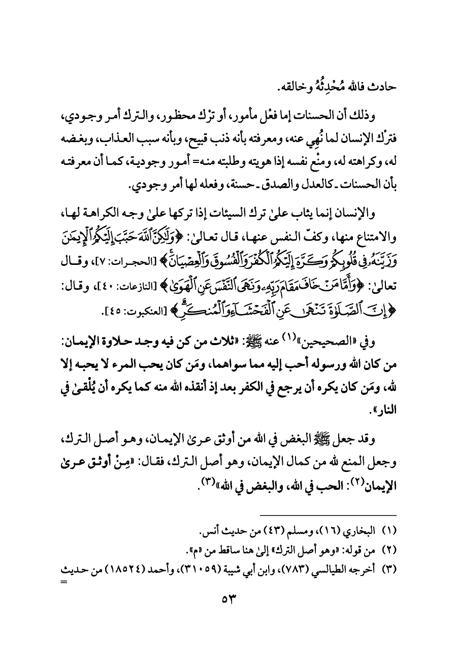 وقد جعل - صلى الله عليه وسلم - البغض في الله من أوثق عرى الإيمان، وهو أصل الترك، وجعل المنع لله من كمال الإيمان، وهو أصل الترك، فقال: «مِنْ أوثق عرى الإيمان (¬٢): الحب في الله، والبغض في الله» (¬٣).