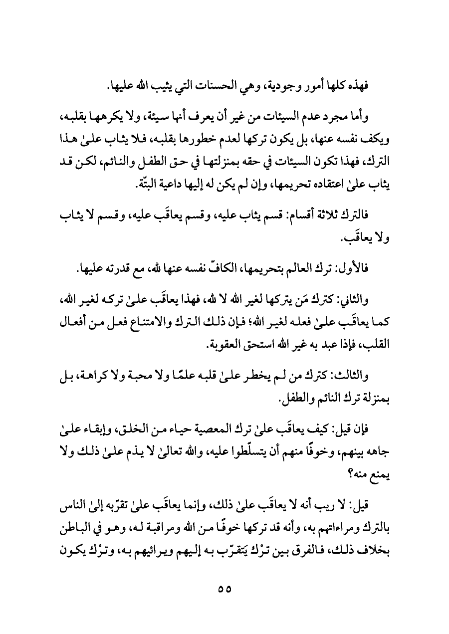 قيل: لا ريب أنه لا يعاقَب على ذلك، وإنما يعاقَب على تقرّبه إلى الناس بالترك ومراءاتهم به، وأنه قد تركها خوفًا من الله ومراقبة له، وهو في الباطن بخلاف ذلك، فالفرق بين ترْك يَتقرّب به إليهم ويرائيهم به، وترْك يكون