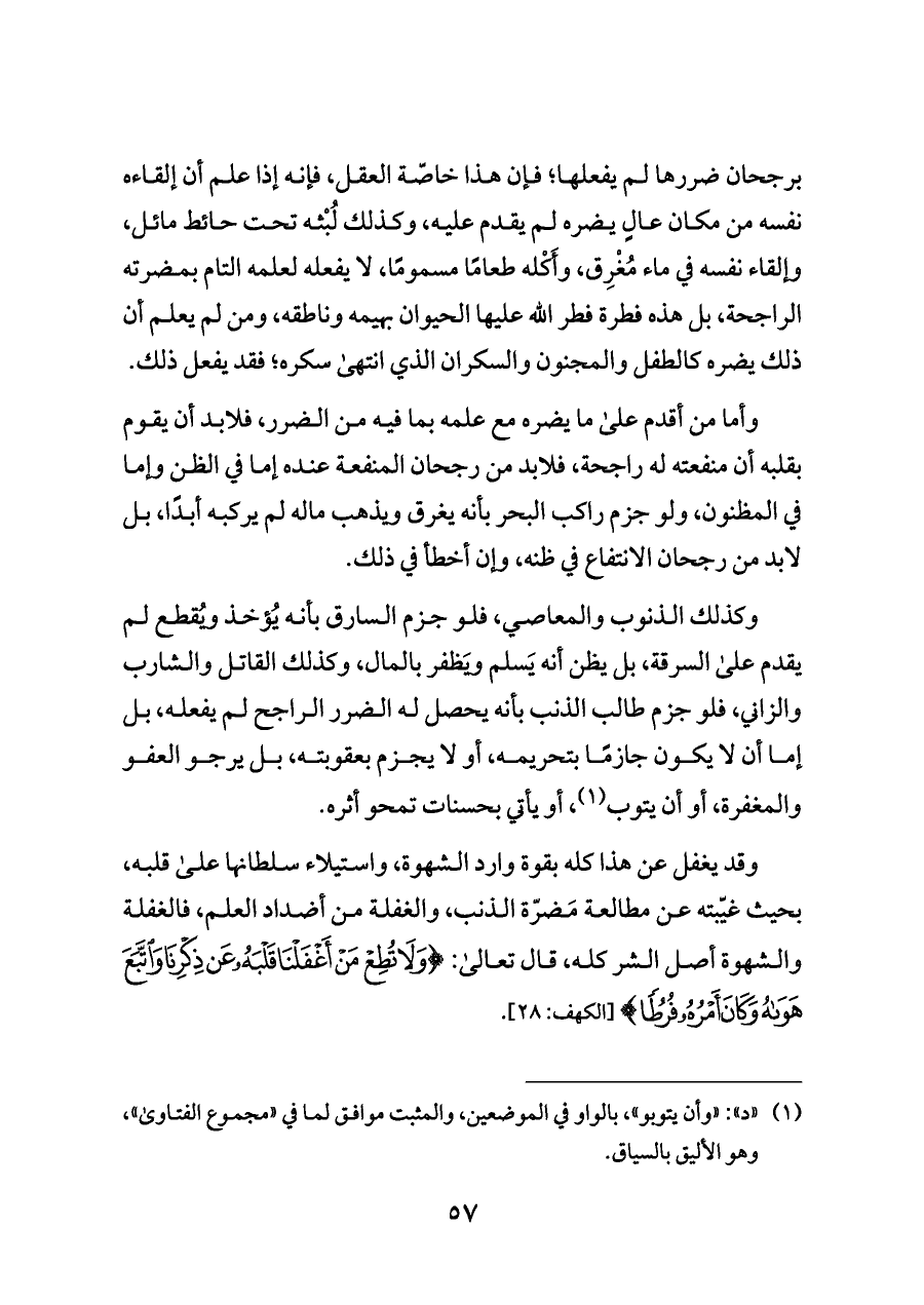 وكذلك الذنوب والمعاصي، فلو جزم السارق بأنه يُؤخذ ويُقطع لم يقدم على السرقة، بل يظن أنه يَسلم ويَظفر بالمال، وكذلك القاتل والشارب والزاني، فلو جزم طالب الذنب بأنه يحصل له الضرر الراجح لم يفعله، بل إما أن لا يكون جازمًا بتحريمه، أو لا يجزم بعقوبته، بل يرجو العفو والمغفرة، أو أن يتوب (¬١)، أو يأتي بحسنات تمحو أثره.