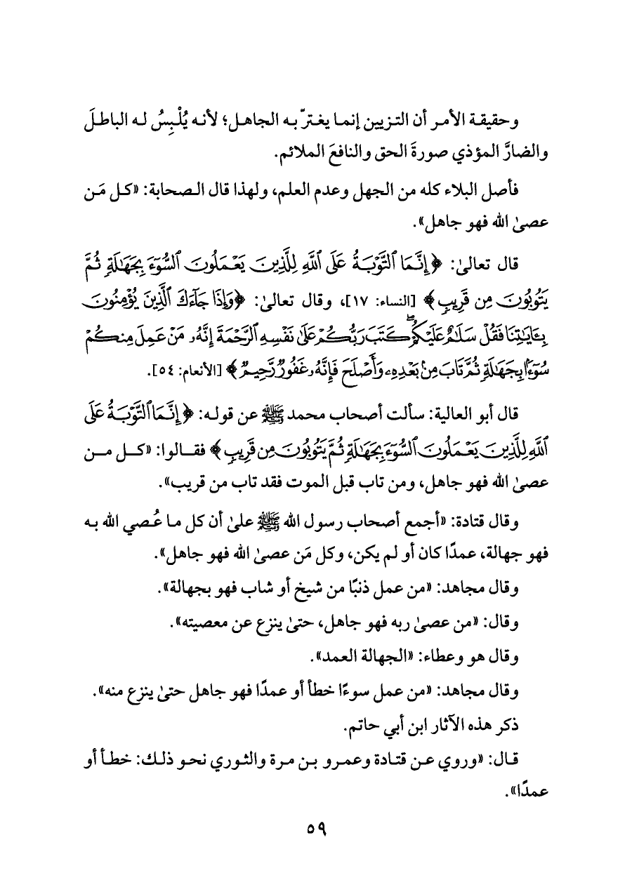 وقال قتادة: «أجمع أصحاب رسول الله - صلى الله عليه وسلم - على أن كل ما عُصي الله به فهو جهالة، عمدًا كان أو لم يكن، وكل مَن عصى الله فهو جاهل».