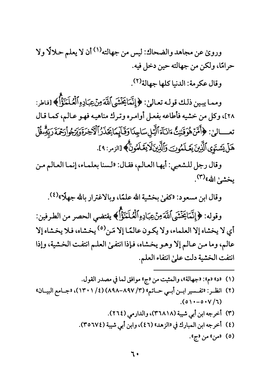 ومما يبين ذلك قوله تعالى: {إِنَّمَا يَخْشَى اللَّهَ مِنْ عِبَادِهِ الْعُلَمَاءُ} [فاطر: ٢٨]، وكل من خشيه فأطاعه بفعل أوامره وترك مناهيه فهو عالم، كما قال تعالى: {(٨) أَمَّنْ هُوَ قَانِتٌ آنَاءَ اللَّيْلِ سَاجِدًا وَقَائِمًا يَحْذَرُ الْآخِرَةَ وَيَرْجُو رَحْمَةَ رَبِّهِ قُلْ هَلْ يَسْتَوِي الَّذِينَ يَعْلَمُونَ وَالَّذِينَ لَا يَعْلَمُونَ} [الزمر: ٩].