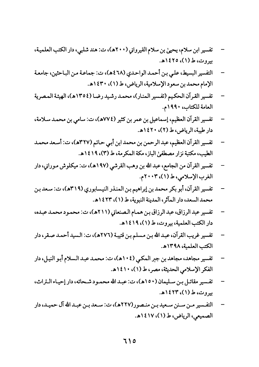 - تفسير ابن سلام، يحيى بن سلام القيرواني (٢٠٠ هـ)، ت: هند شلبي، دار الكتب العلمية، بيروت، ط (١)، ١٤٢٥ هـ.